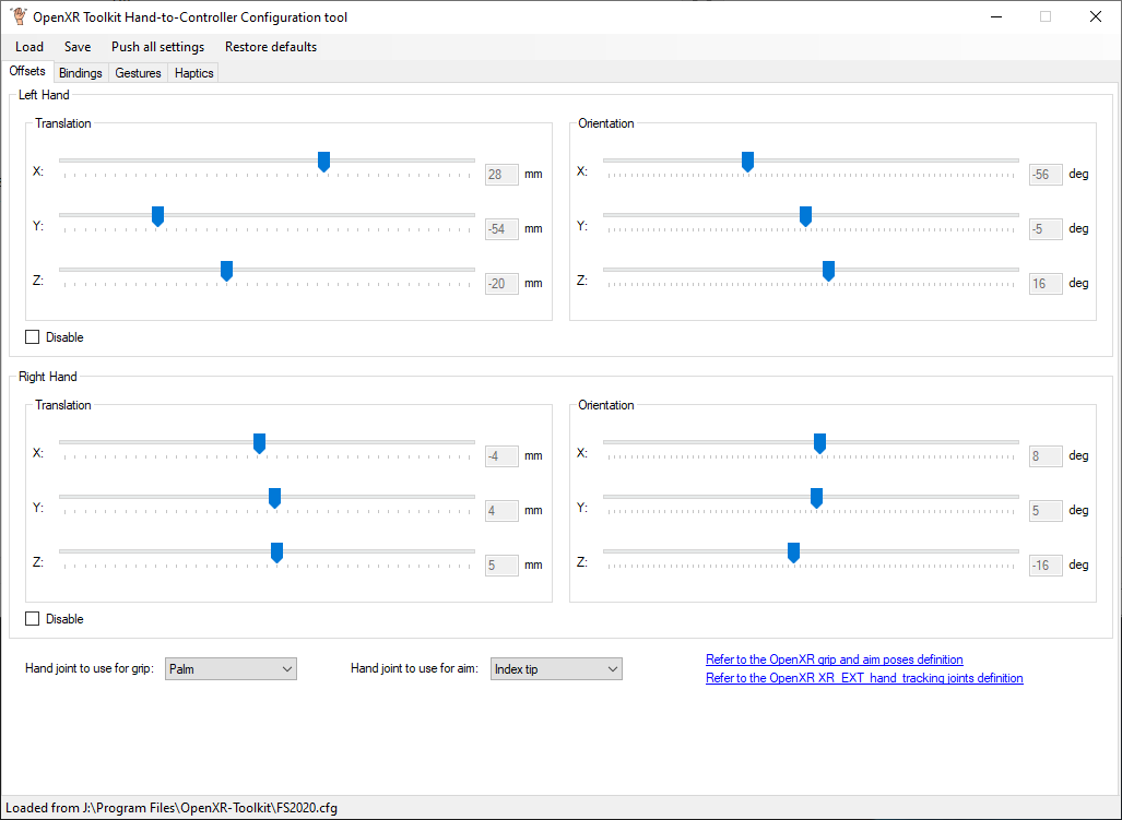 Sure! I spent quite a bit of time finding the most convenient settings for me. Note that I’m using INDEX TIP for aim, i.e. my index finger determines where controller is pointing, which is more twitchy but much more natural than trying to aim with the whole palm. So Translation and Orientation settings are based on that: aligning the controller arrow with the tip of my index finger.