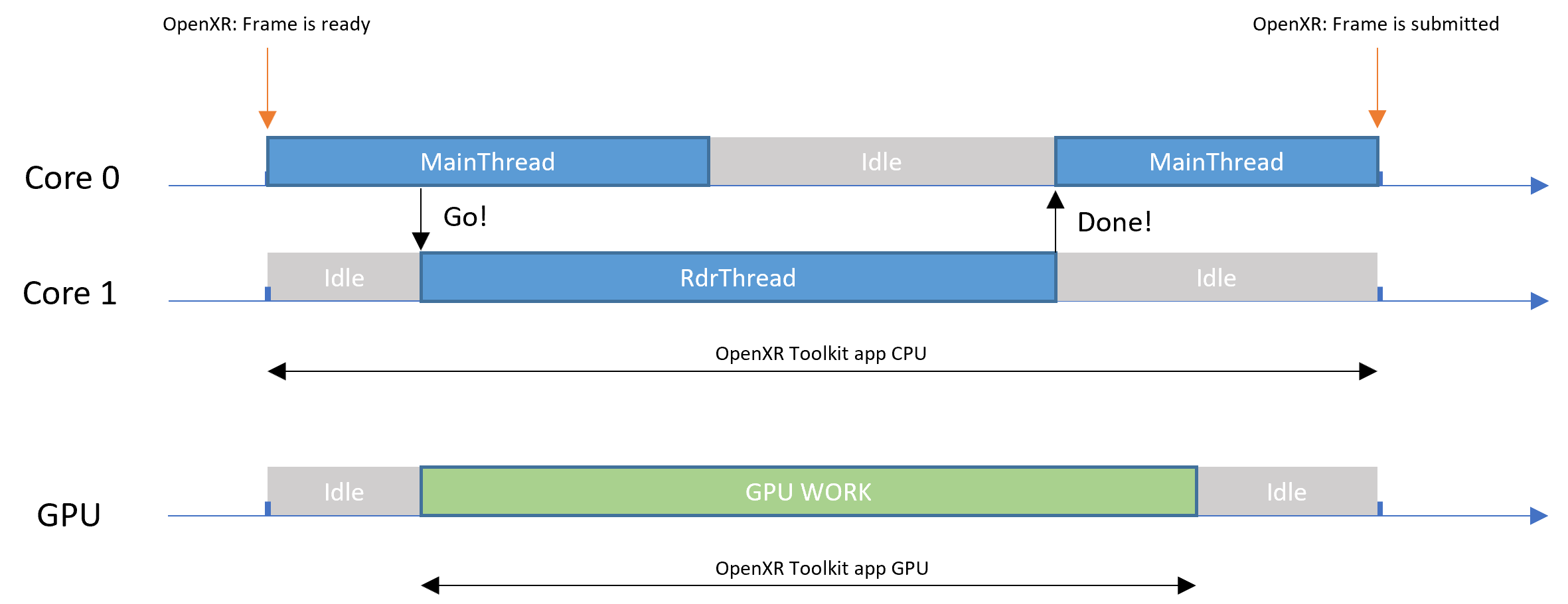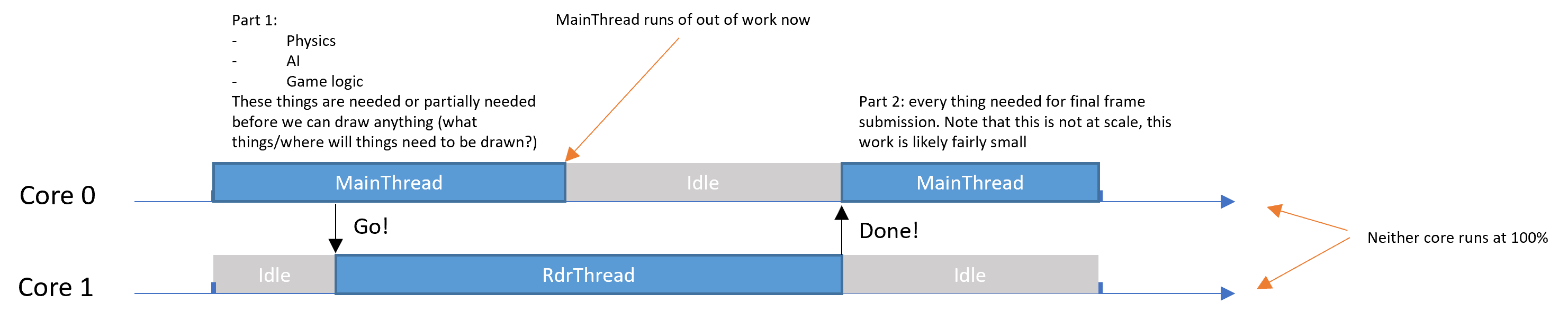 - Meanwhile, RdrThread is waiting until the MainThread has a sufficient clear picture of what needs to be rendered. When this happens, Core 1 is idle.