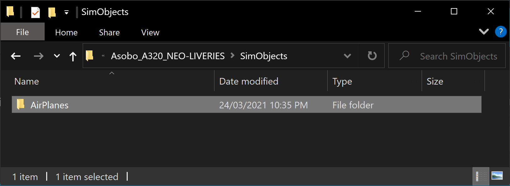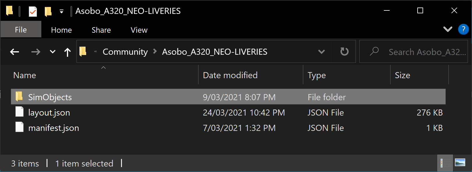 I use a single mod folder, and place all my liveries inside it. Both default A320 and A32NX liveries under one mod folder, since I need them to “share” texture files among them. I even added some A32NX Coffee cup textures that I can assign it on the livery level so that the coffee cups follow whenever I switch to another airline livery.
