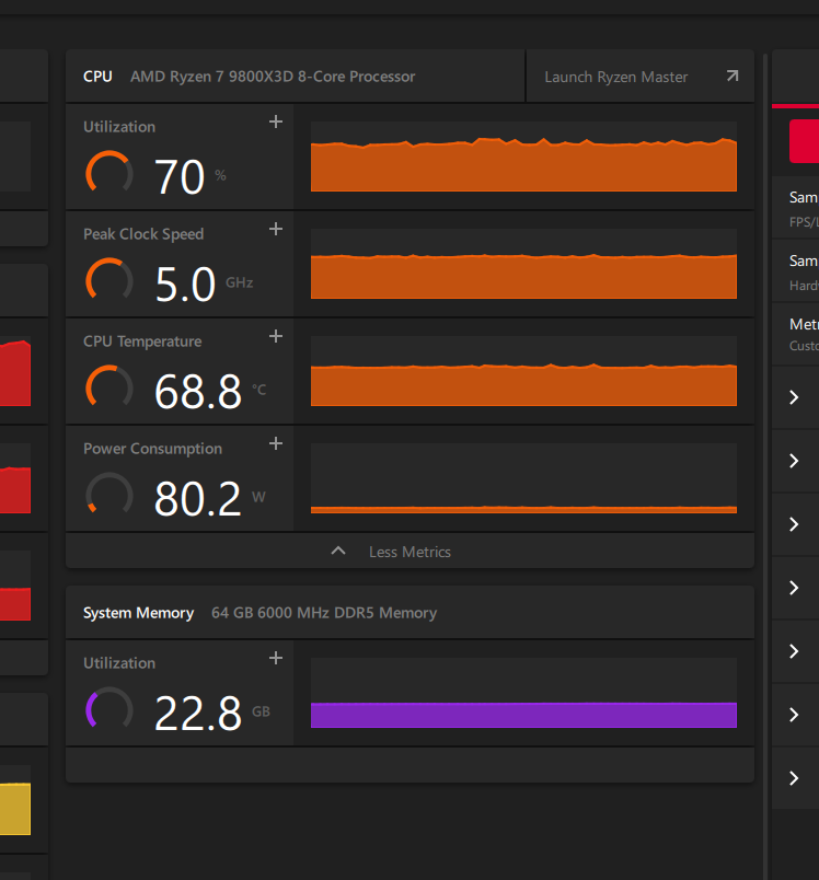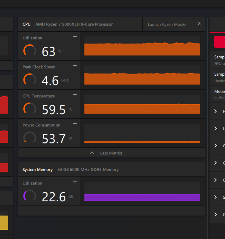 As for my 9800X3D, when I first load up the sim and the CPU ramps up workload, I’ve seen temps rise up to the low 70s for a few seconds; however, the cooler soon catches up and within a few seconds temps have dropped to low 60s and within another 5-10 seconds, once the coolant has started pulling heat out of the die, temps run in line with my GPU temps or cooler - upper 40s in cruise, mid 50s when busy on the ground.