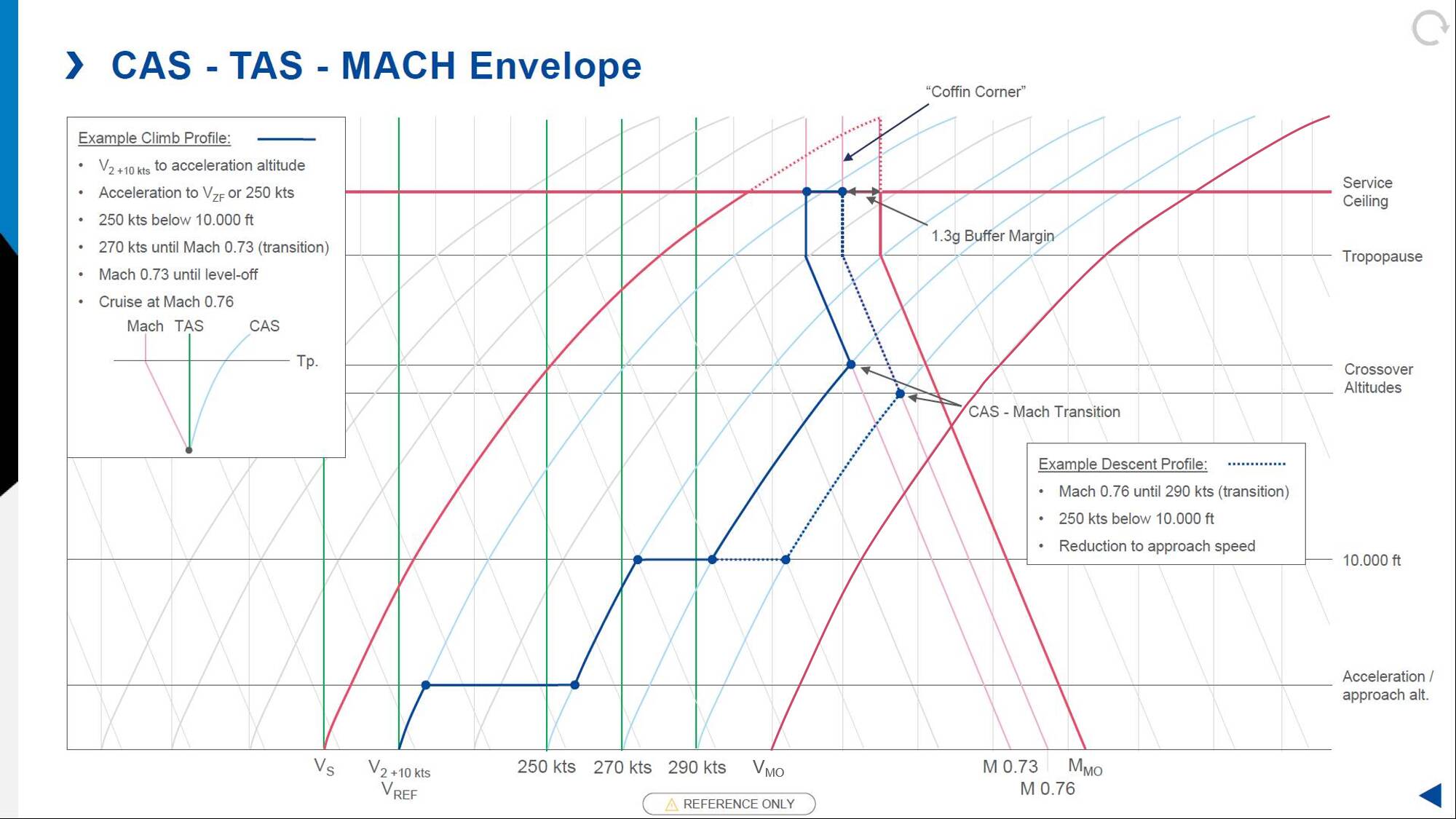 At some point you’ll need to change over from constant CAS climb to constant Mach climb, this altitude is called the “crossover altitude”. In the graph below you can see the relationship between CAS, TAS and MACH illustrated.