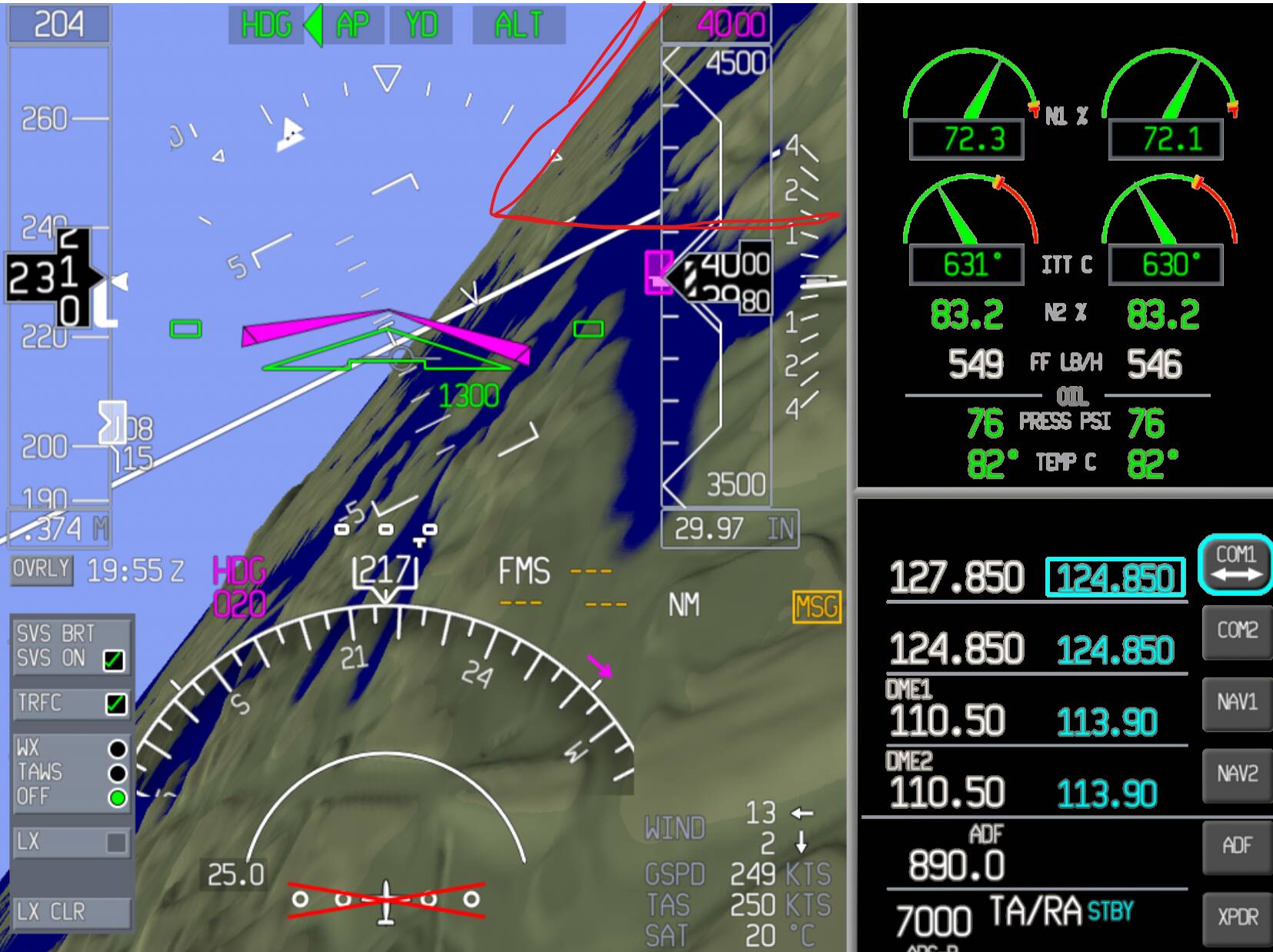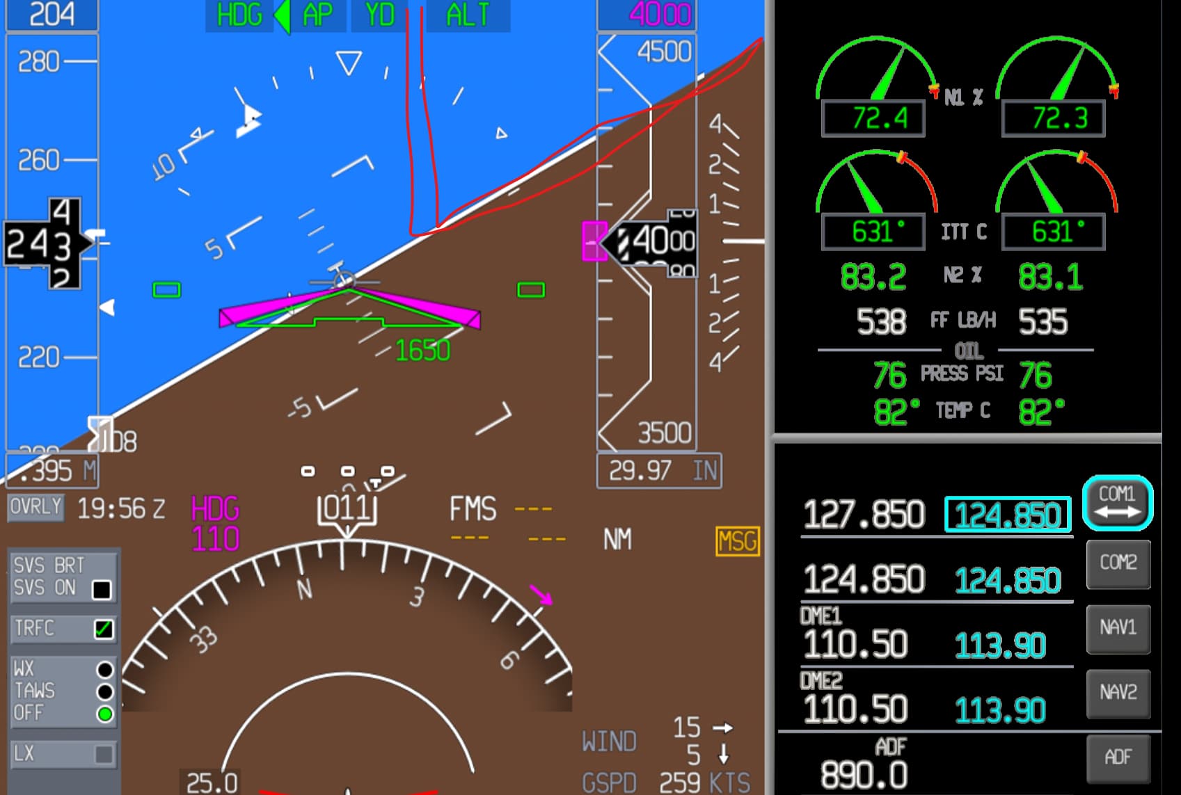 - the bank shown on attitude indicator (while SVS is on) will show a bank of about 60 degrees (no matter if banking to the left or right)