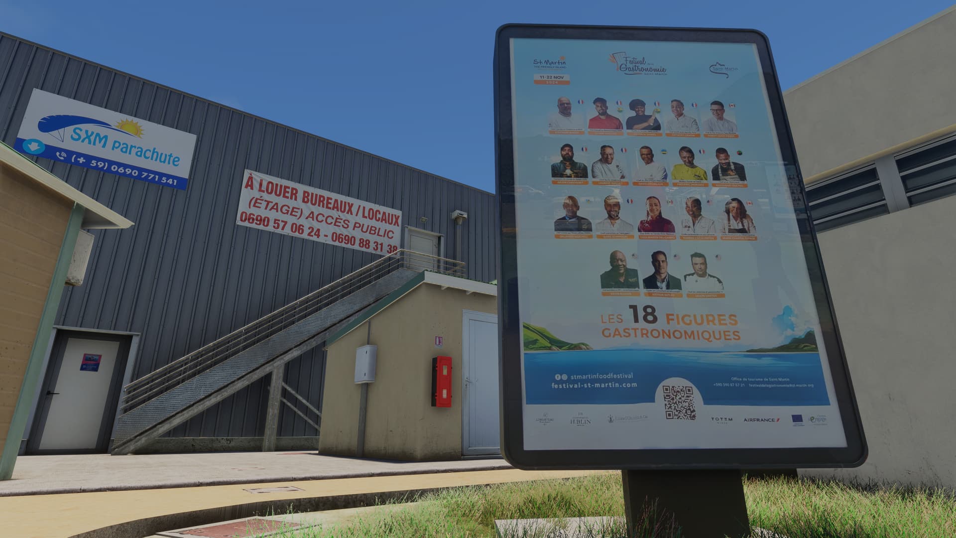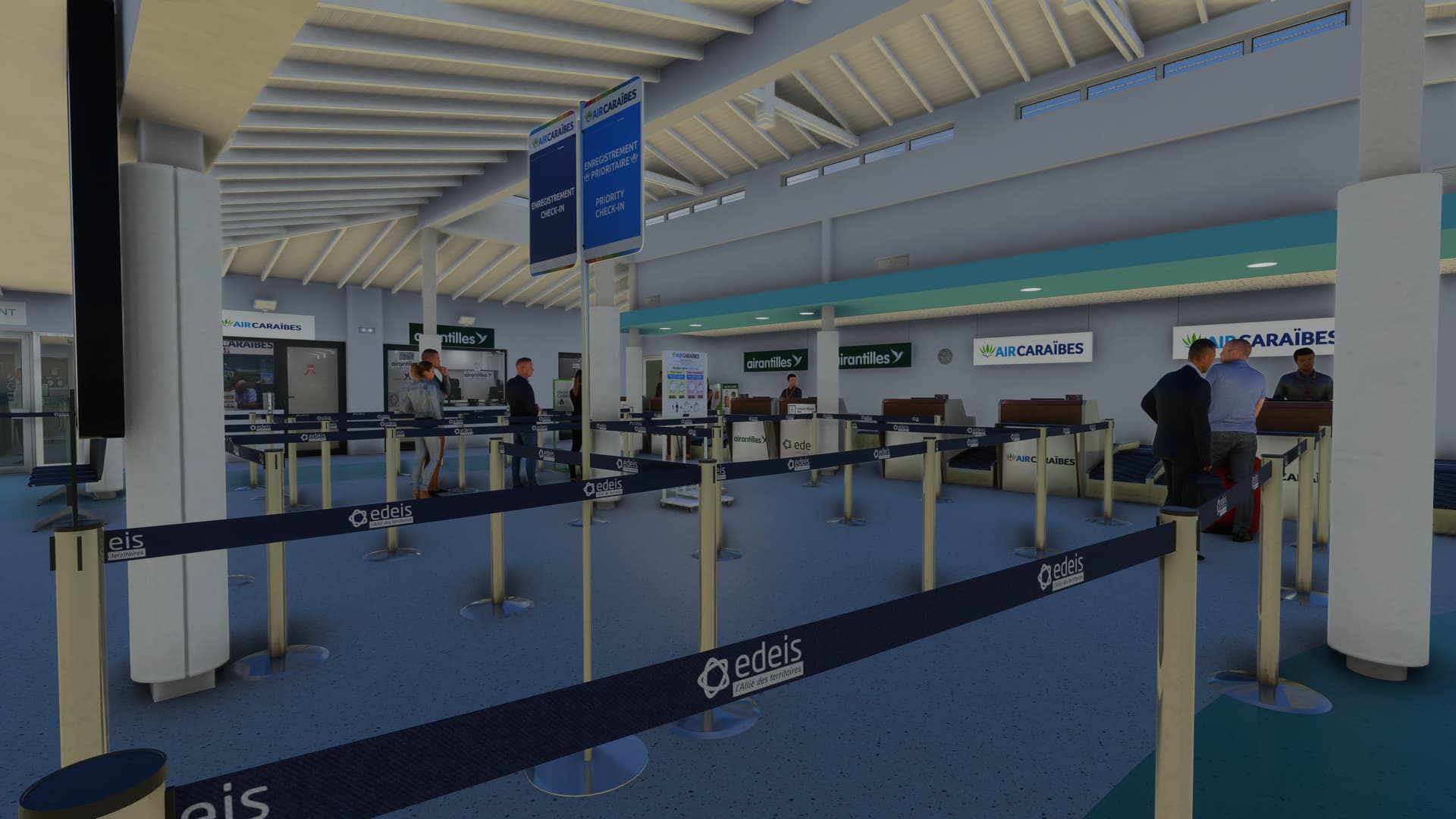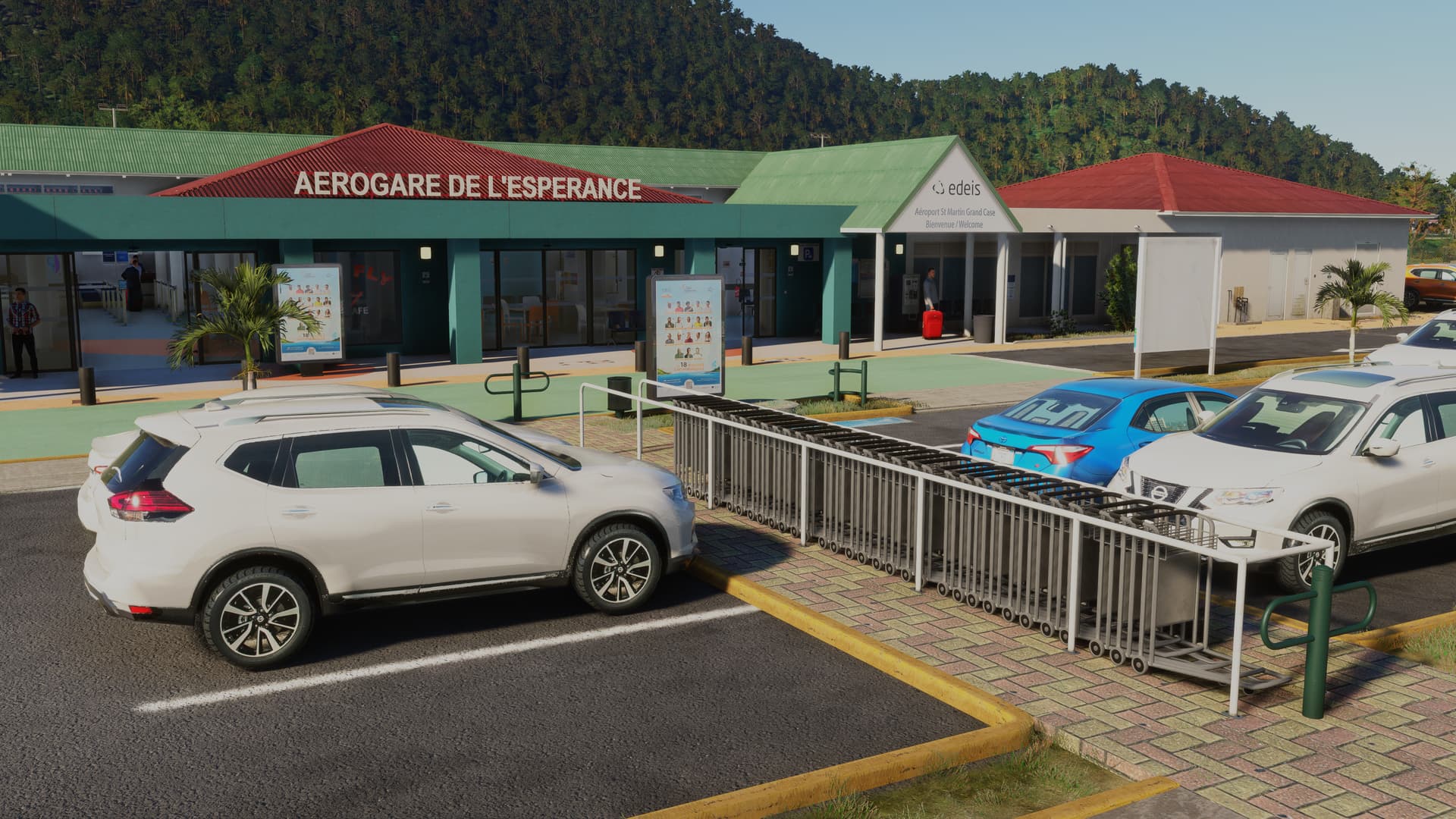 The terminal and its landside are simply fantastic, in every way. Ramp clutter is plentiful and entirely custom. Like the previous SLH airport (SOCA), there are animated ramp vehicles tailored to this particular airfield. There’s a near-full interior included, in which even the toilet interiors are modelled! Ridiculous! There are static people all over the place (plus some animated examples) and the vehicles populating the car-parks on and around the airport are custom models. The perimeter fence is custom and features a variety of gates and signs (without any real repetition). The landside features just as much detail as airside, with various signs, barriers, fences, advertisements, etc. Listing all the fine detail on offer would take an eternity but, rest assured, every place you look is crammed full of it!