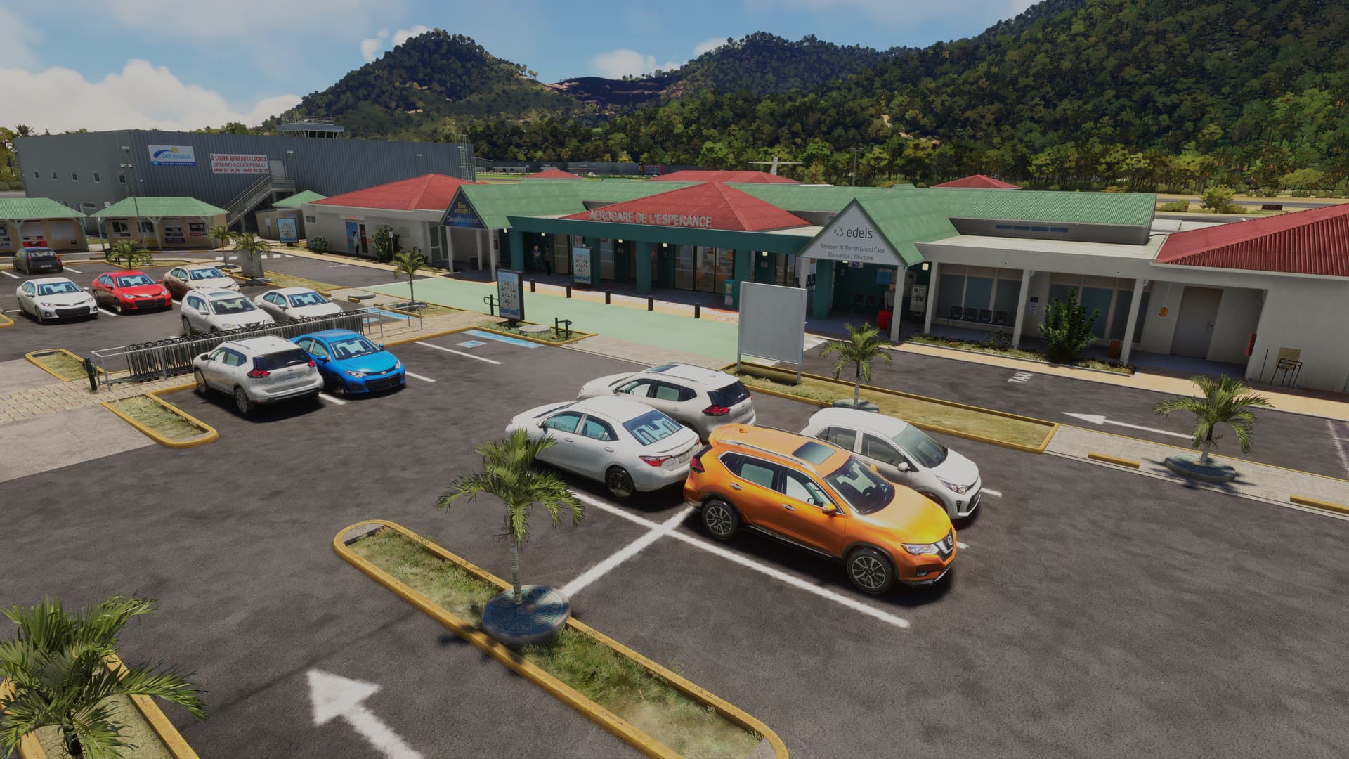 The airport is just a stone’s throw from a good number of Caribbean islands, although the primary route out of here is Pointe-a-Pitre (with ATRs of Air Caraibes and Air Antilles). Unusually, departing ATRs must make a turn at the runway end, then use reverse thrust to align themselves with a set of ground markers — this ensures the absolute full length of the runway is available, and the scenery does feature these unique ground markings.