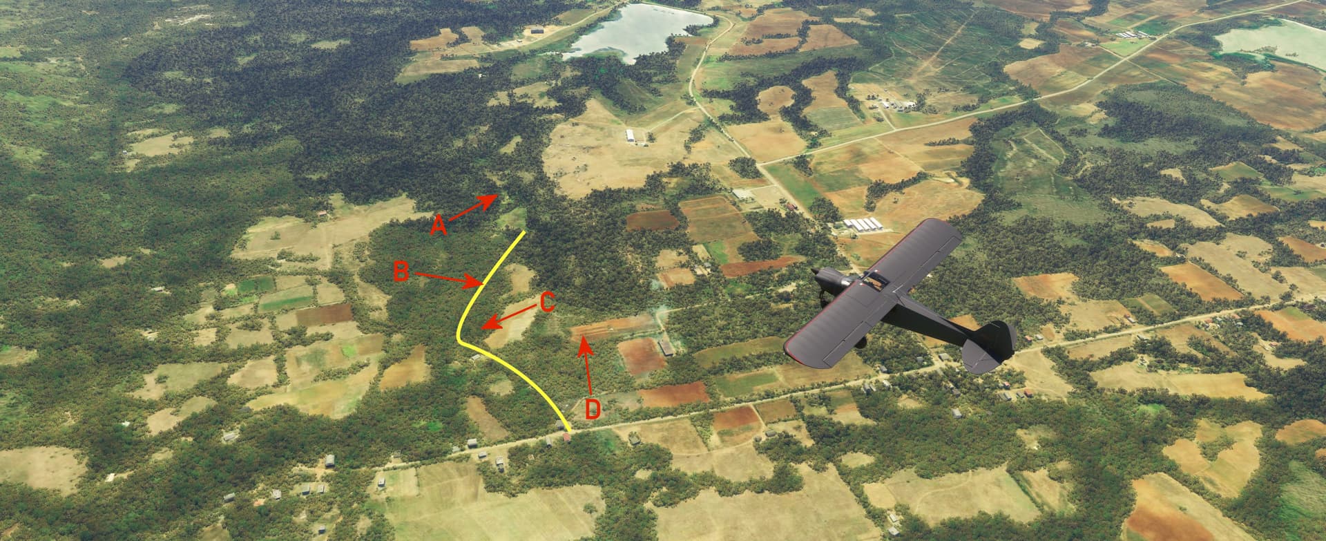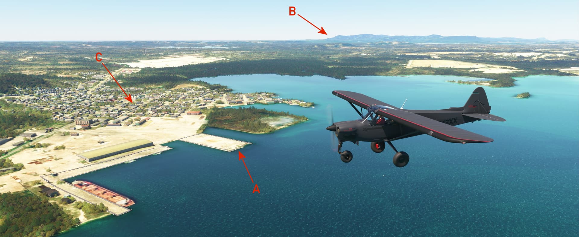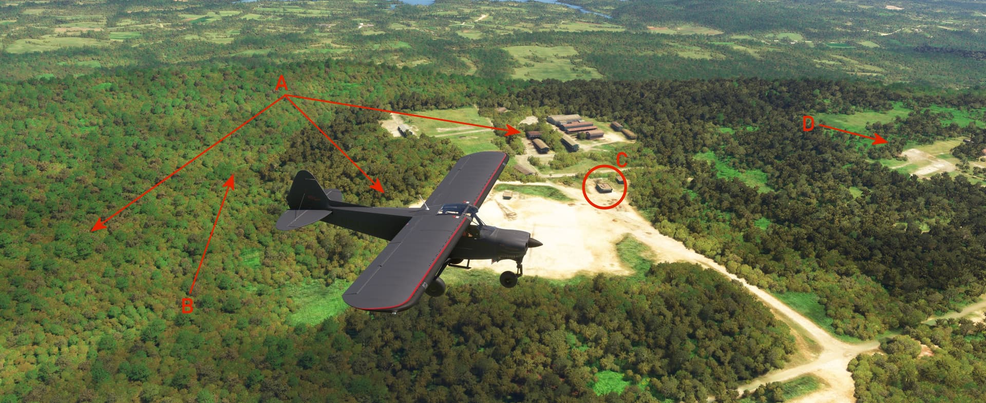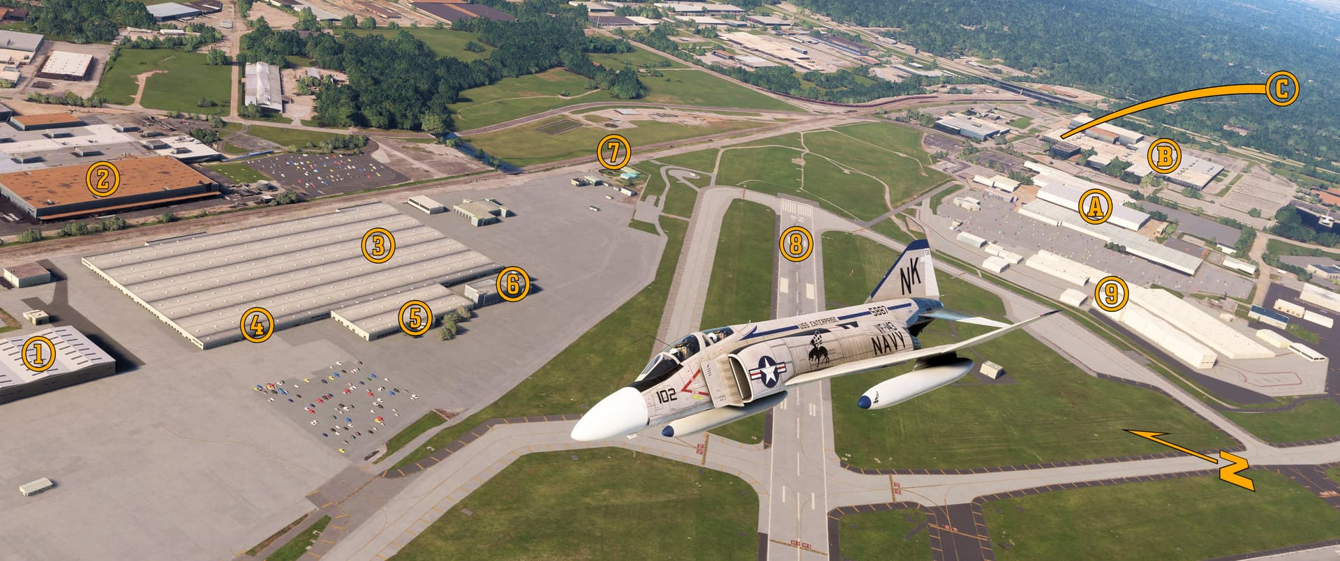 Pee-Wee says: Here we are flying northwest over the former McDonnell (now Boeing) facility at St. Louis Lambert Airport. I’ve marked: (1) the former flight test hangar where newly built aircraft were prepared for flight, (2) the factory building where aircraft sub-assemblies and equipment were built before heading across the railroad tracks to (3) the Building 42 “low bay,” where construction of individual airframes began. (4) Here’s the exit from Building 42’s final assembly “high bay” where the iconic McDonnell Aircraft sign was painted, and where many aircraft had their glamour shots taken. MSFS has this building wrong: the high bay should be twice as tall as the low bay. (5) Here’s the general and engineering offices and the (6) engineering annex. This (7) is the former Wabash Railroad mainline paralleling Banshee Avenue and (8) the threshold of Runway 24. These (9) hangars and (A) buildings are now part of Boeing’s flight test facility, and include (B) Building 101. We’ll talk about (C) in a moment.