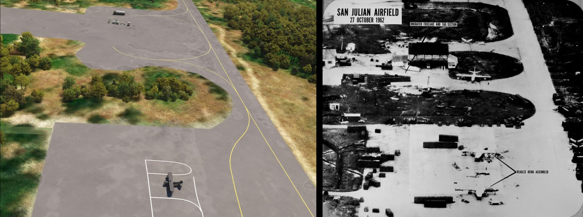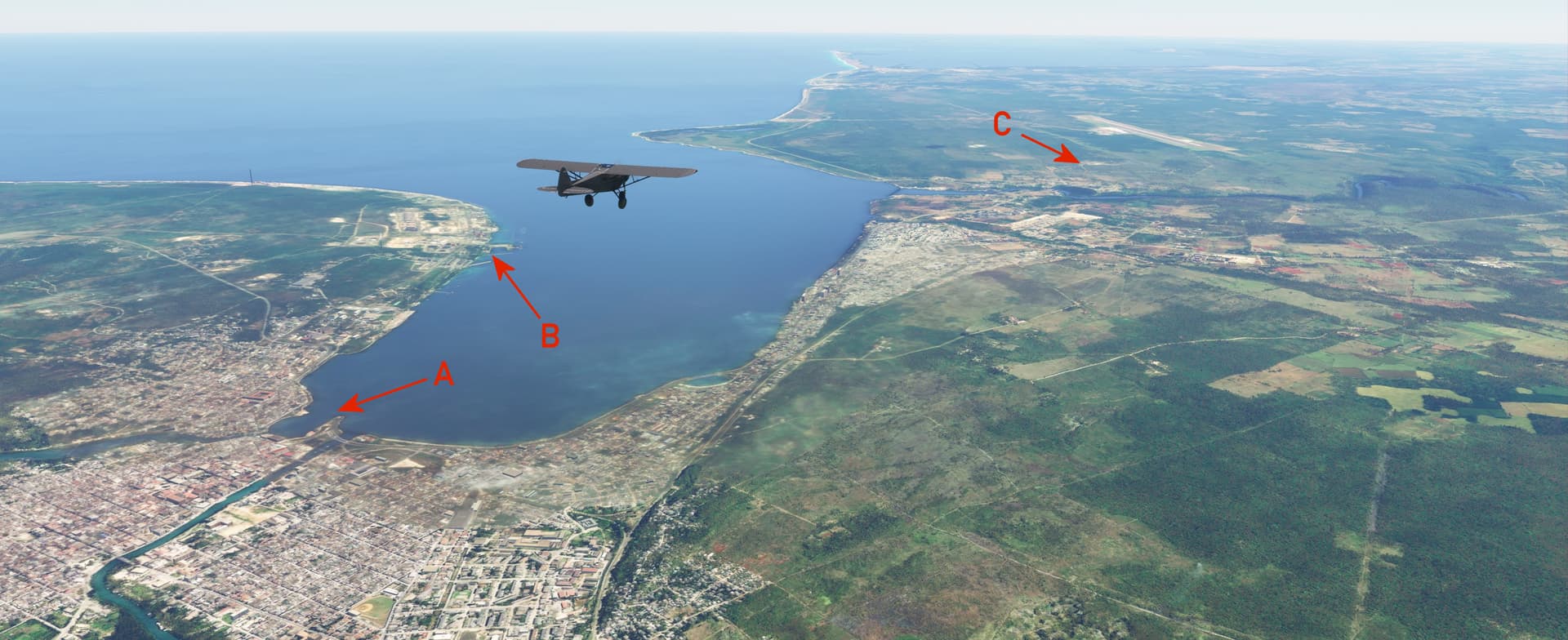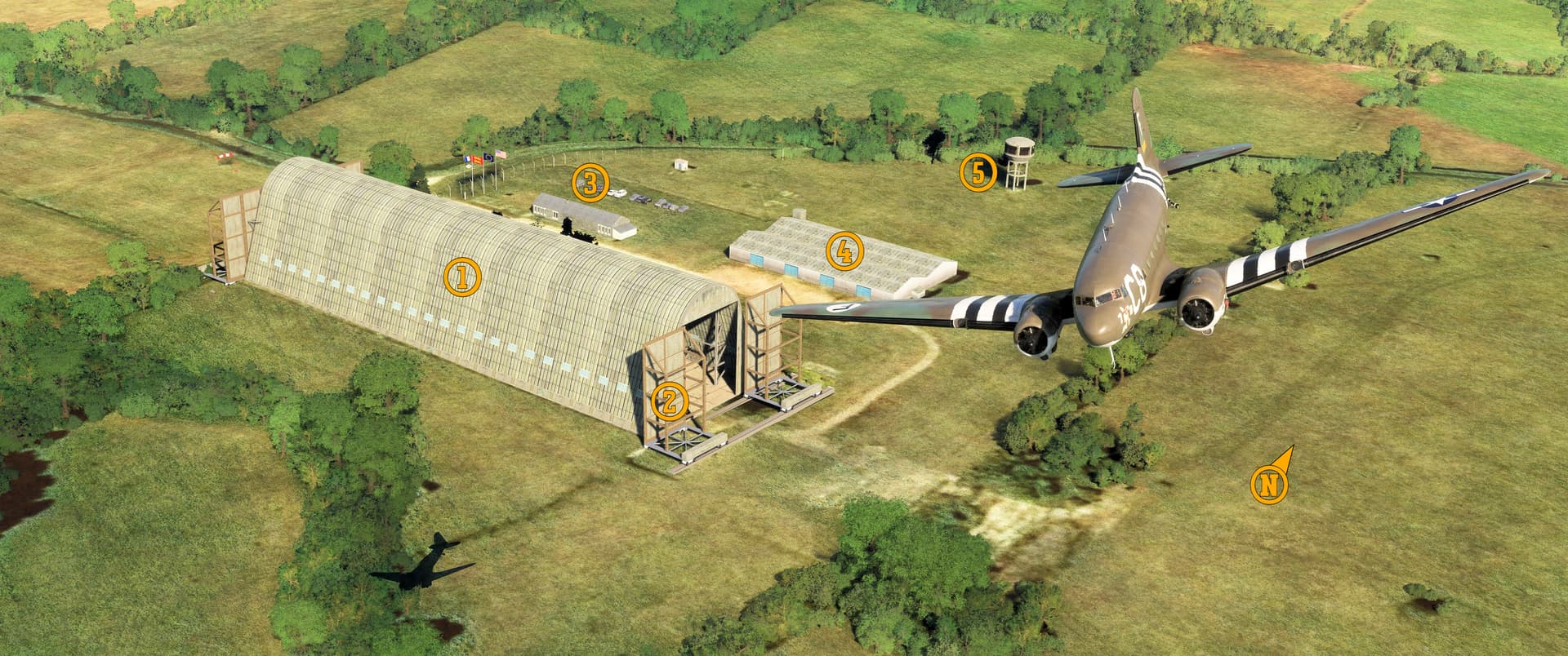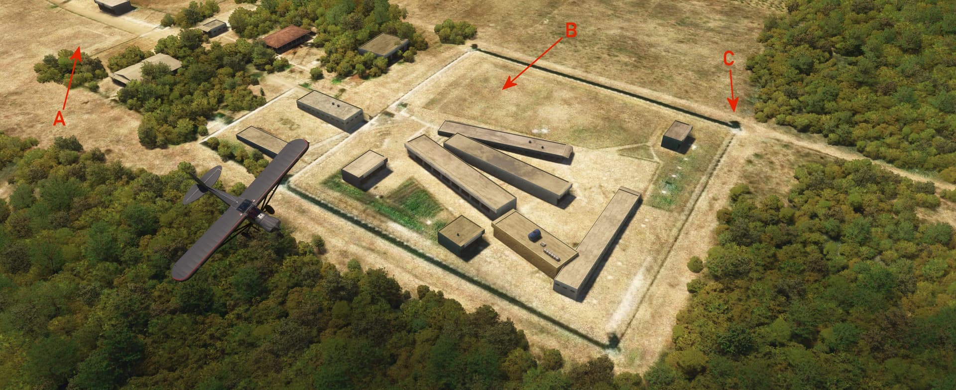 Pee-Wee says: Here we are flying northwest over the former McDonnell (now Boeing) facility at St. Louis Lambert Airport. I’ve marked: (1) the former flight test hangar where newly built aircraft were prepared for flight, (2) the factory building where aircraft sub-assemblies and equipment were built before heading across the railroad tracks to (3) the Building 42 “low bay,” where construction of individual airframes began. (4) Here’s the exit from Building 42’s final assembly “high bay” where the iconic McDonnell Aircraft sign was painted, and where many aircraft had their glamour shots taken. MSFS has this building wrong: the high bay should be twice as tall as the low bay. (5) Here’s the general and engineering offices and the (6) engineering annex. This (7) is the former Wabash Railroad mainline paralleling Banshee Avenue and (8) the threshold of Runway 24. These (9) hangars and (A) buildings are now part of Boeing’s flight test facility, and include (B) Building 101. We’ll talk about (C) in a moment.