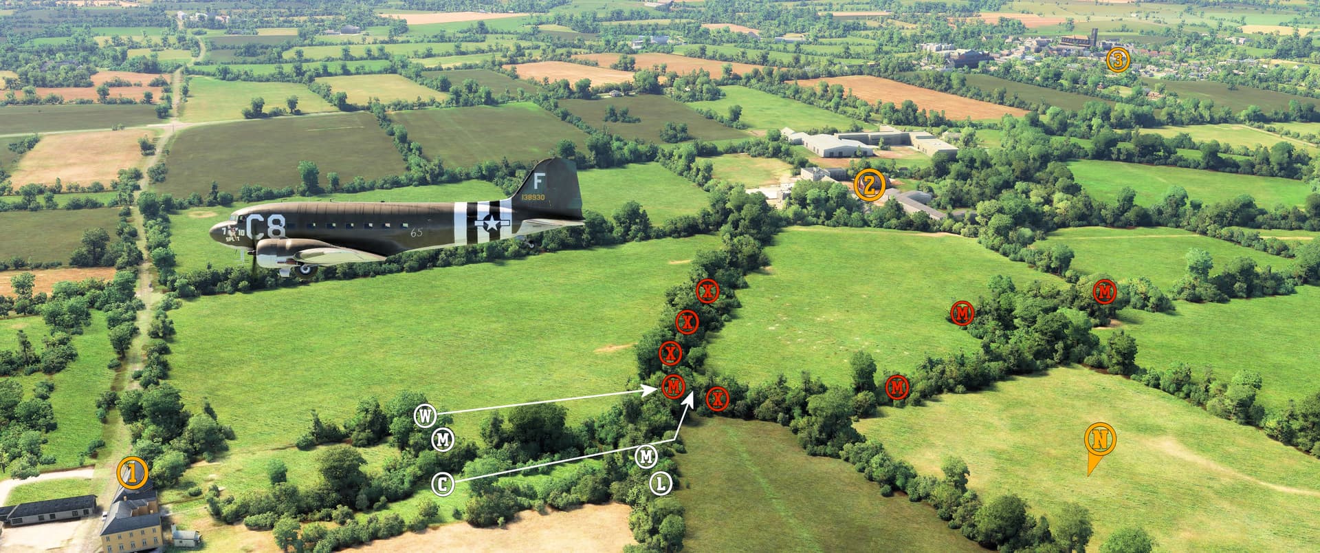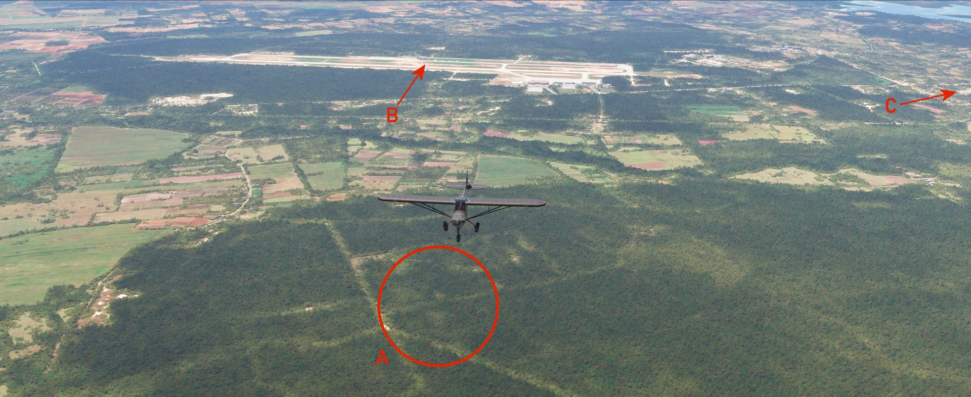 Pee-Wee says: We tookoff from Runway 32L on the military side of the field and circled back around for this overview screenshot, in which you can see: (1) the Scott AFB Heritage Air Park display, which includes a C-9 Nightingale, C-21 executive transport, C-130 Hercules, KC-135 Stratotanker, C-140 Jetstar, and C-141 Starlifter, (2) the 126th ARW’s facilities, (3) Taxiway G connecting the two sides of the airfield, (4) the 932nd AW’s facilities, (5) the commercial passenger terminal, (6) the site of Boeing’s new drone factory, (7) home of the USAF’s Band of Mid-America [shout out to some fellow musicians