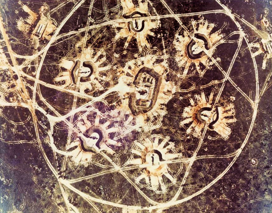 To the west, and unfortunately not included in the Asobo 3D model, were five “woodhenges,” circular collections of partially buried wooden poles arranged similarly to Stonehenge. Only the restored “Woodhenge III” stands today. These wooden calendars were calibrated to their surroundings and required periodic rebuilding as construction and settling changed the sizes and shapes of Cahokia’s mounds.