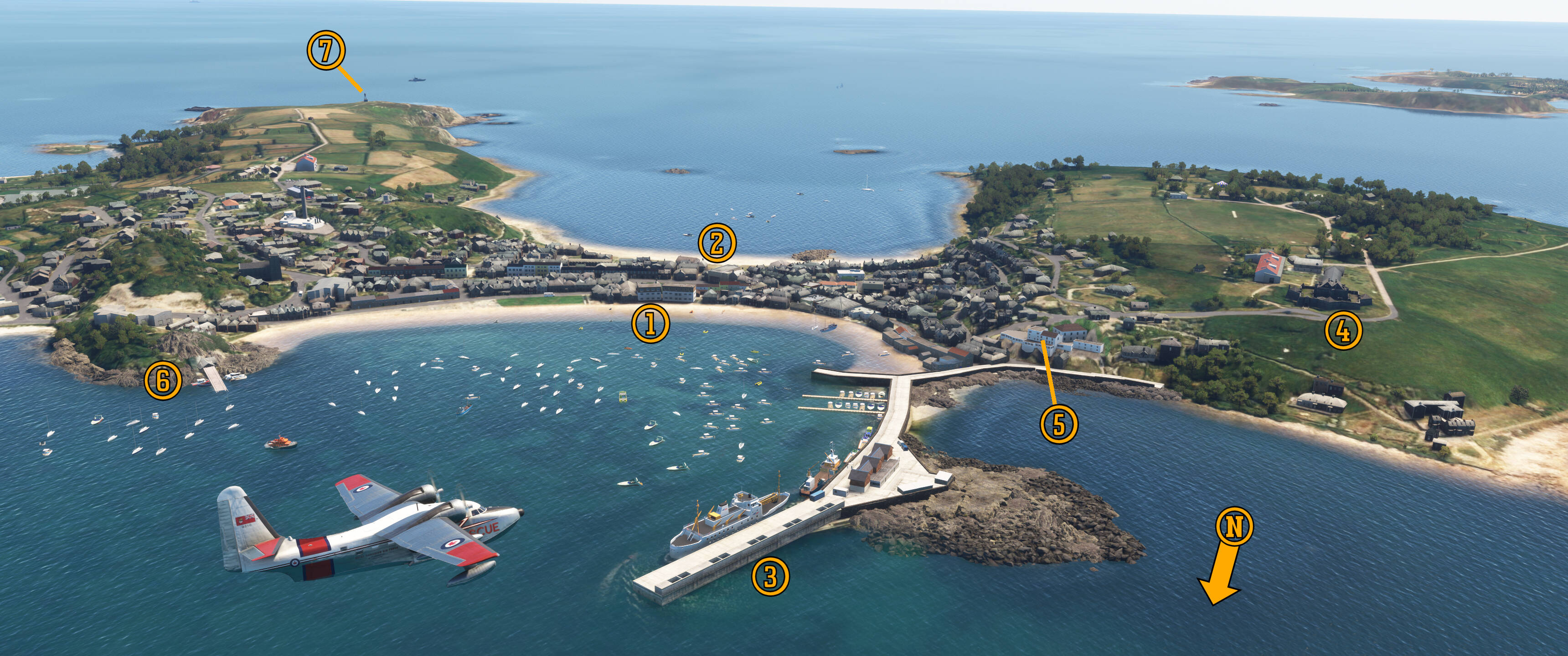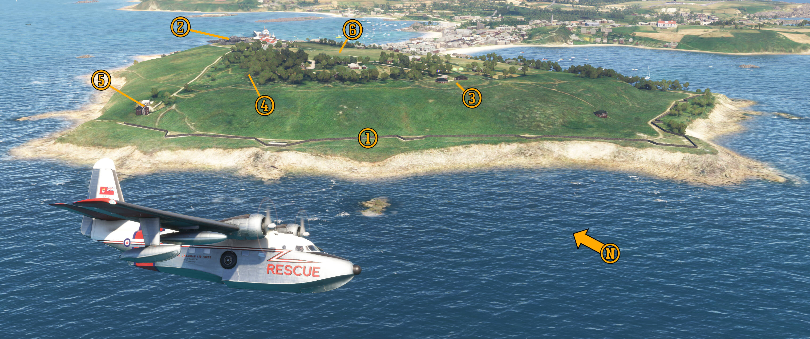 TPF’s original passenger terminal stood on the airport’s south side (3) here. It was razed in the 1960s and replaced by the current building which today houses fixed-base operator Atlas Aviation. This (4) boat ramp off Severn Avenue is the old seaplane ramp into the anchorage. Across Tampa Bay you can barely make out the (5) Sunshine Skyway and (6) Albert Whitted and Al Lang Field.