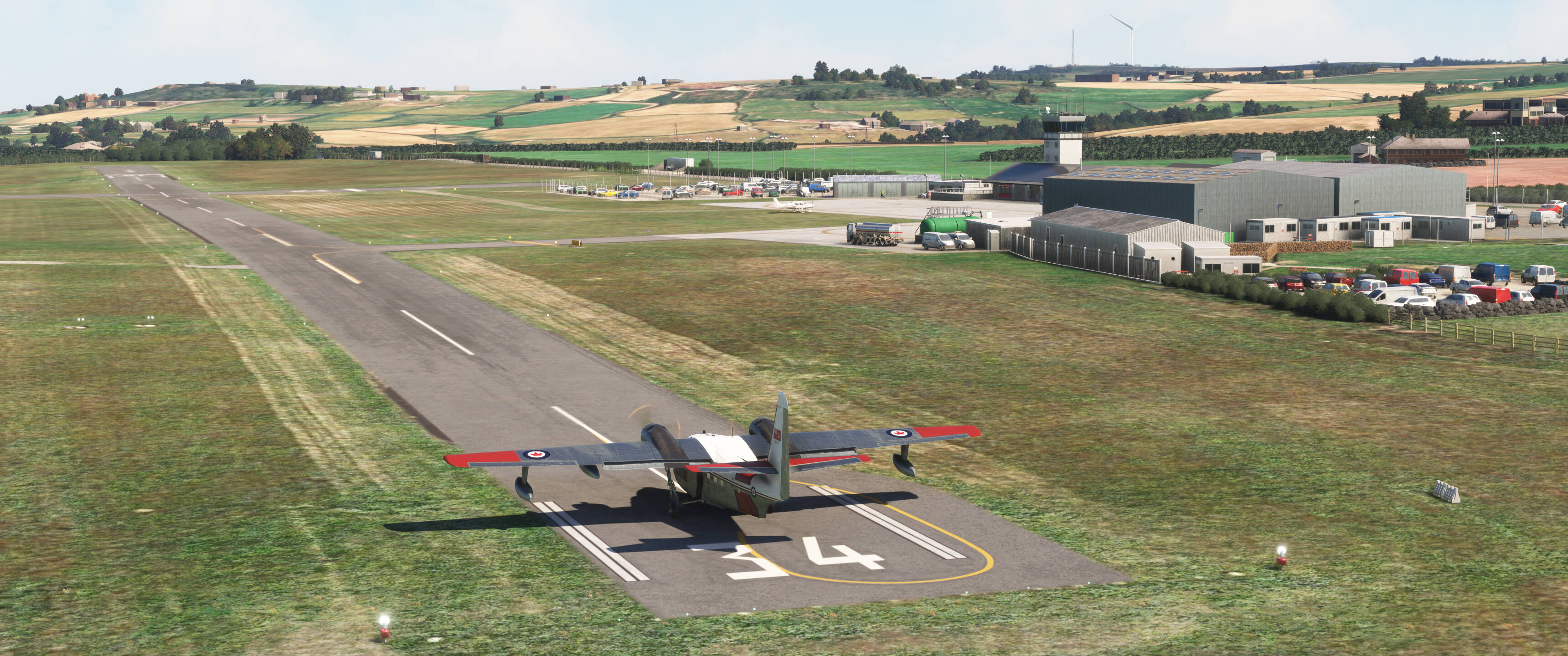 We’re looking southeast across the airfield in this photo. Dutch taxis his B-47 down the former (1) Runway 19 to this exact spot, where the (2) film crew was waiting. A few seconds later, Dutch taxis into position on (3) Runway 22. The runway certainly appears wide, and it was: in 1954, Runway 22 was an astonishing 500 feet (152 meters) wide! It’s since been reduced to a more normal 150 feet (46 meters), although you can still see the original width in the discolored grass.