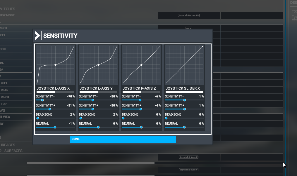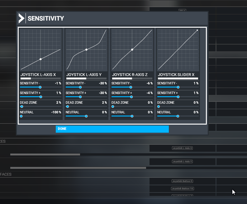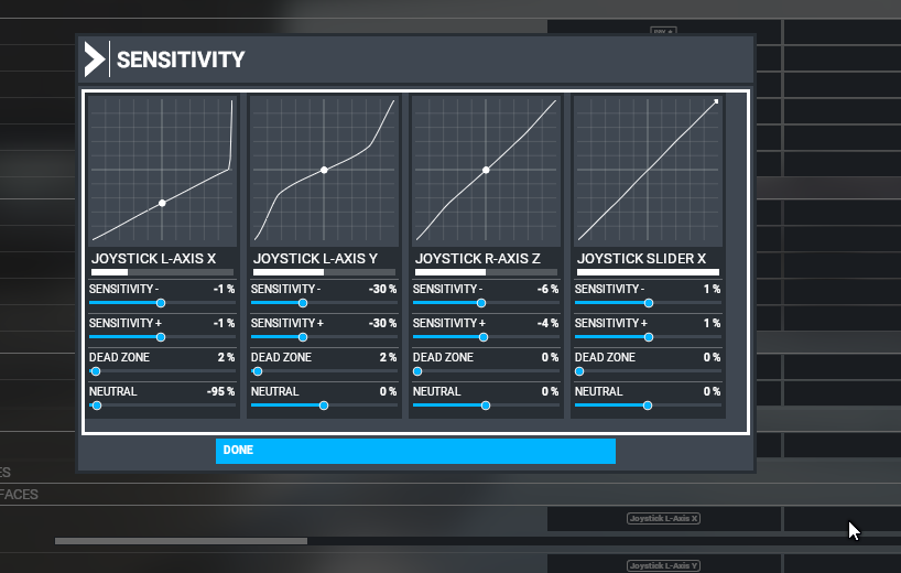 I am a bit confused as to how the sensitivity input/output graph is suppose to work. I assume that the graph represents the input on the X-graph-axis(horizontal) and the output is on the Y-graph-axis (Vertical). The graph starts at the zero-zero (0,0) point. For the joystick this seems to be reasonable. Move the joystick left and right the dot move left and right to represent the displacement input signal left and right. You tweak the values to get a corresponding output value.