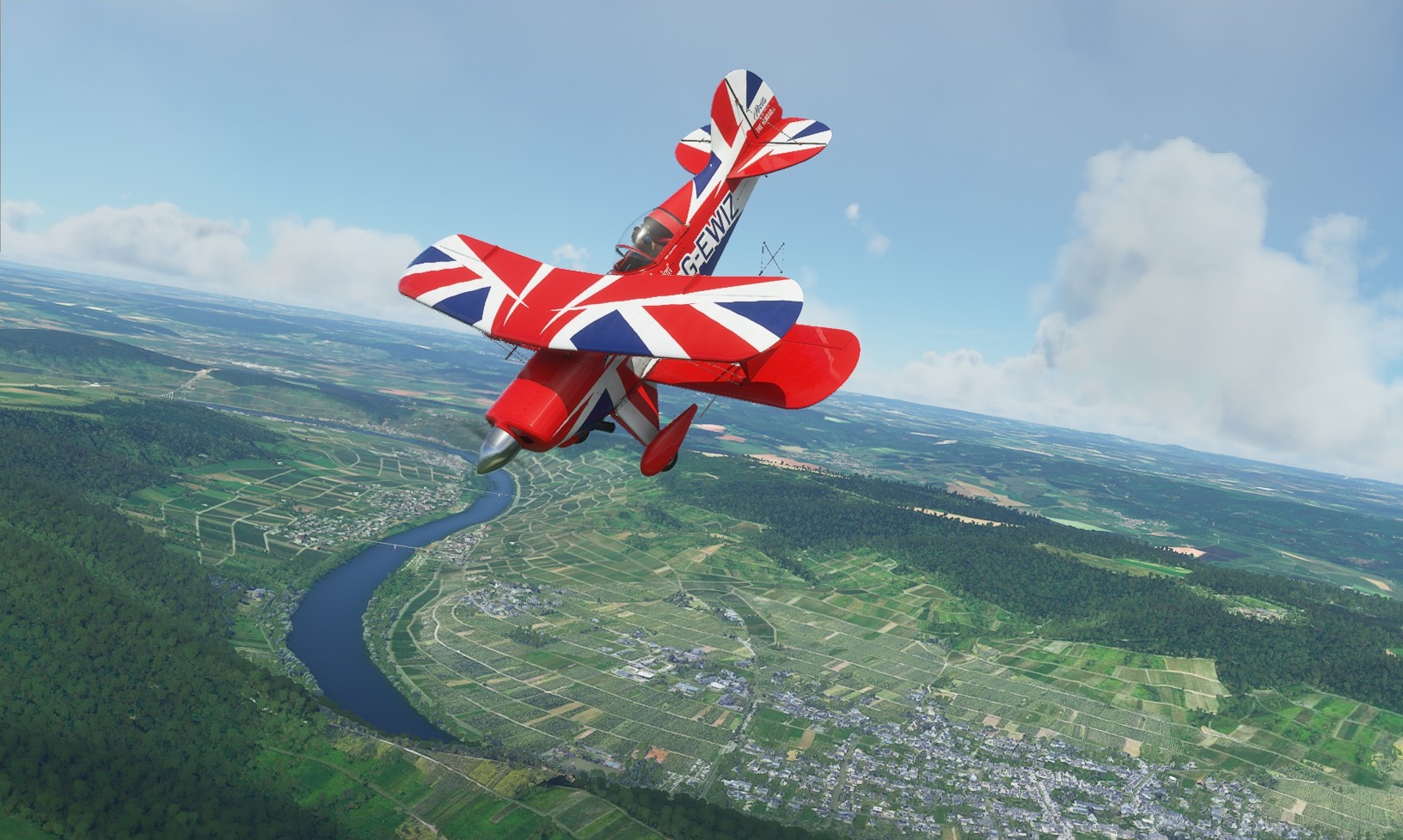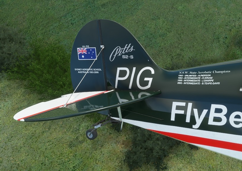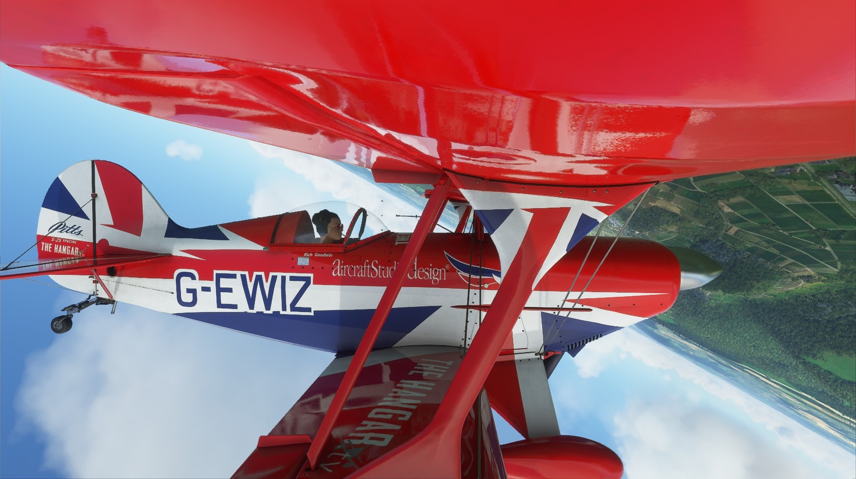 This more flamboyant livery is flown by Rich Goodwin. Due to the well-known limitations of the MSFS texture mapping, my repaint is a rendition of the livery it carried in 2015, when it just carried the Union Jack for the first time.