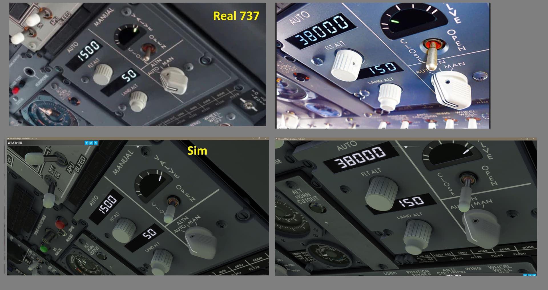 On some pictures it looks like the FLT ALT and LAND ALT labels of the new differential pressure panel have a bit smaller font than the rest of the labels, while on the older NG differential pressure panels all fonts have the same size… but I am not really sure, because I cannot find any 737 MAX overhead panel pictures.