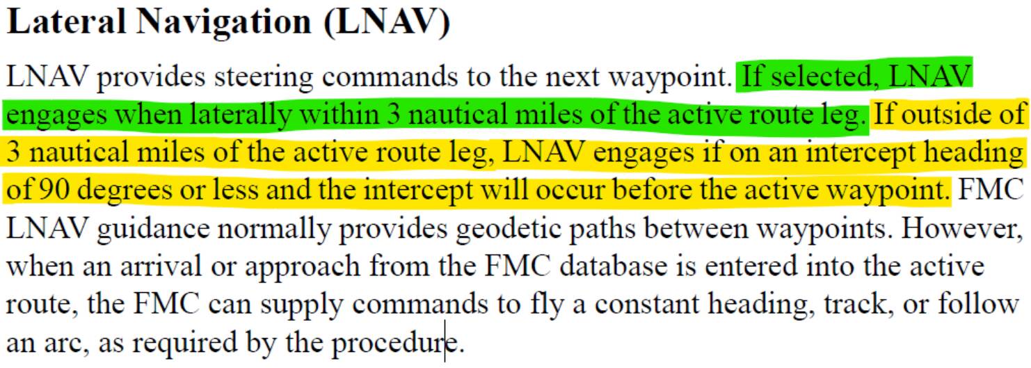 If these conditions aren’t met you’ll get the “NOT ON INTERCEPT HEADING”. The course of action is usually to use HDG SEL to establish yourself on an intercept heading and then arm LNAV.