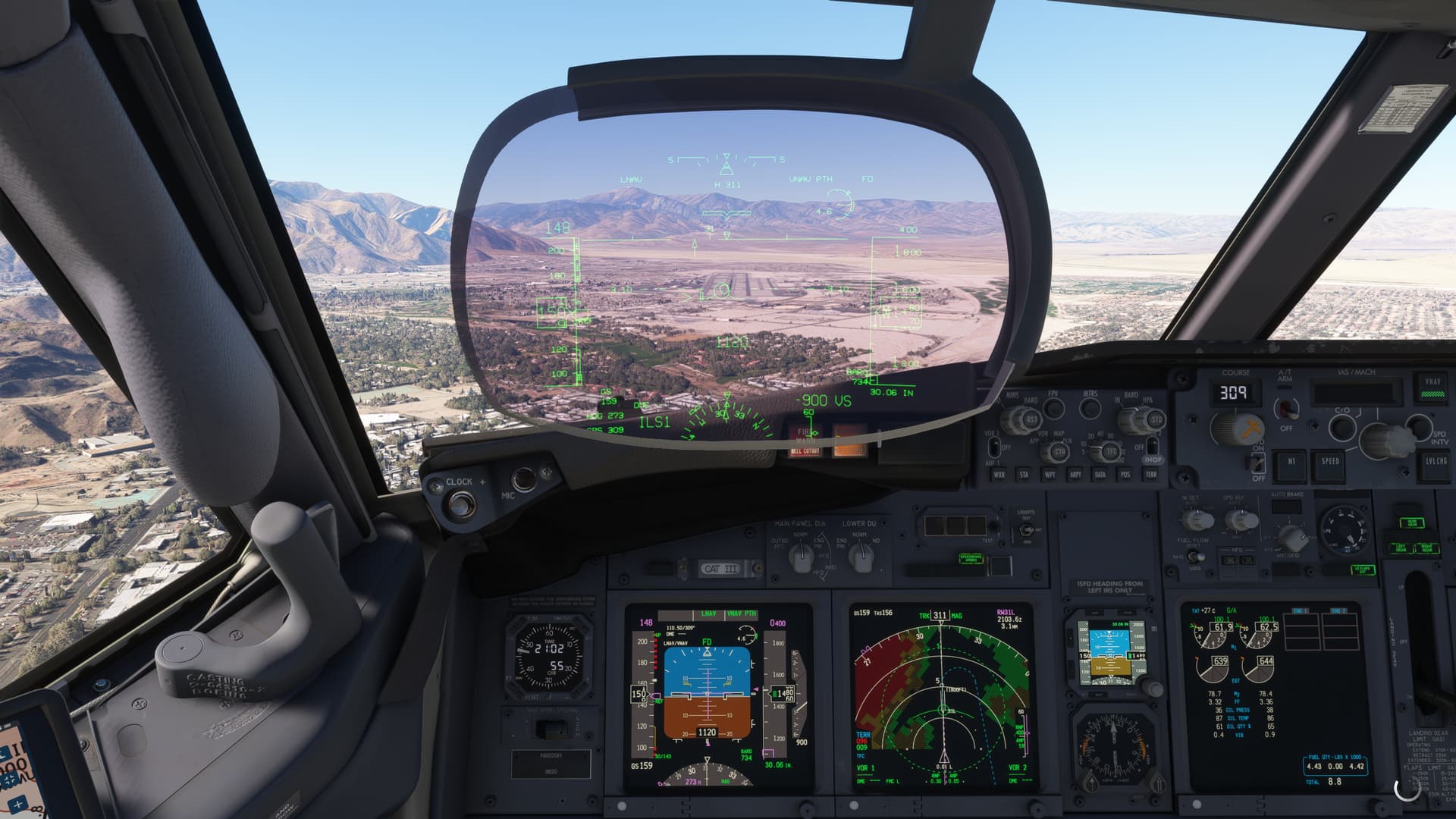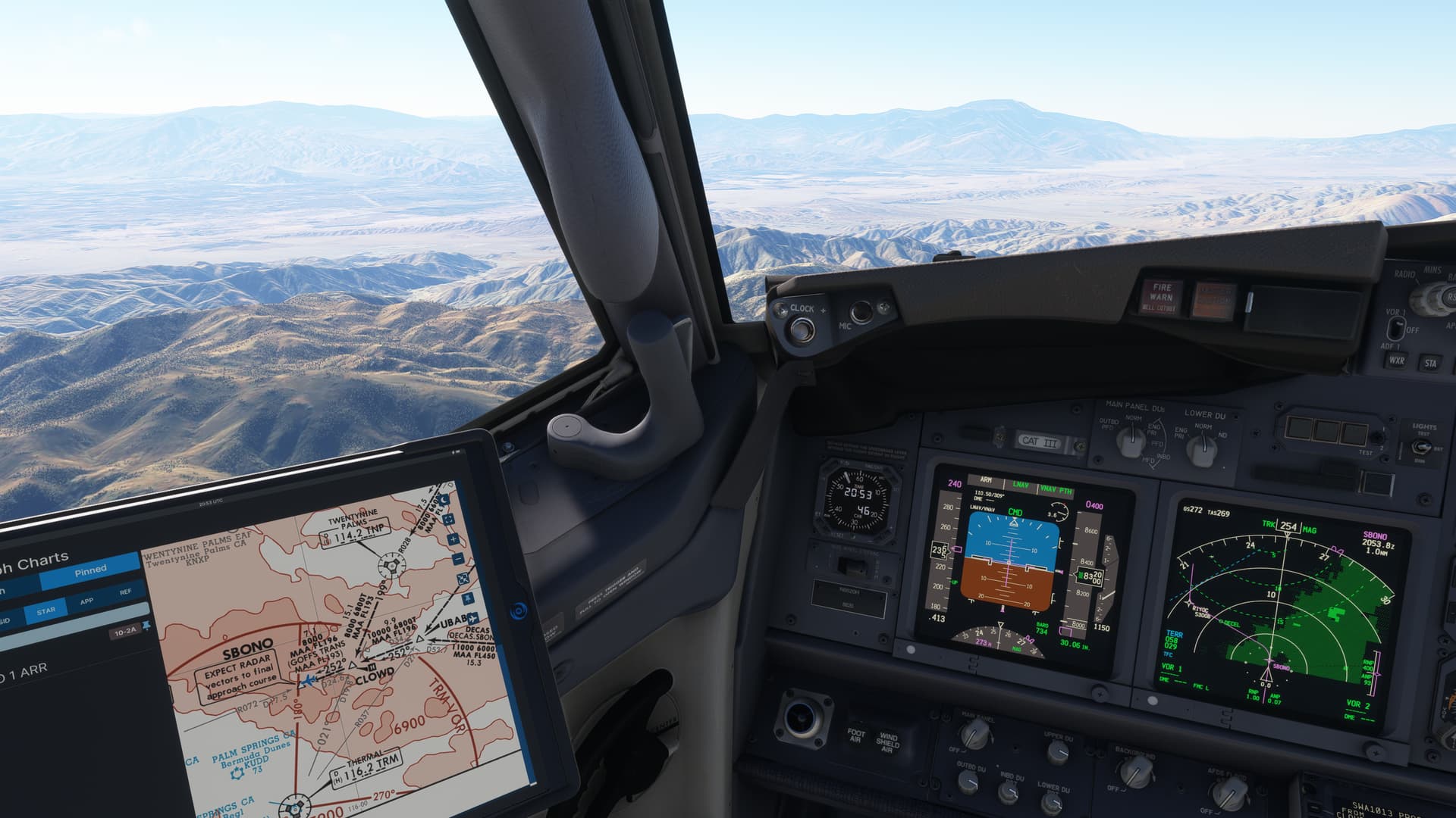 I had a slow day today so during my lunch, I planned and loaded up a flight in the -800 from KBNA to KPSP, taxied out and took off, climbed to cruise and then let the (virtual) FO and autopilot handle most of the rest until descent and landing. Four and a half hours, more or less, and the longest real-time flight I’ve made in a good while. BTW, the RNAVY into 31L at Palm Springs is breathtaking.