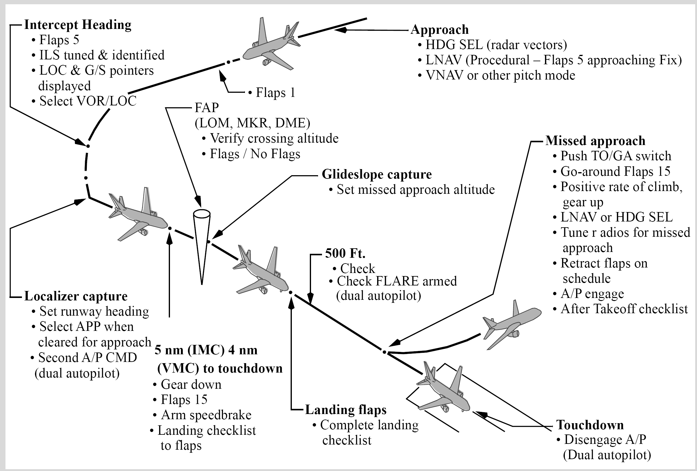 This is a diagram from the QRH. It contains some stuff for the dual channel approach (autoland) like disconnecting the autopilot on touchdown. Ignore that part if you want.