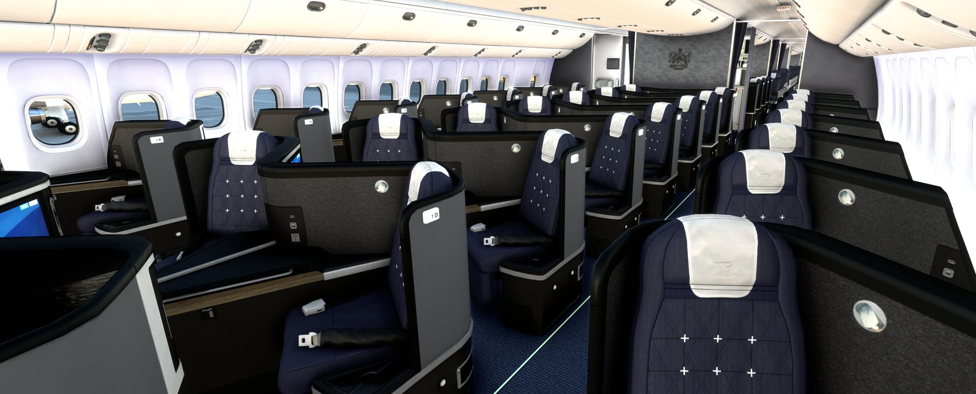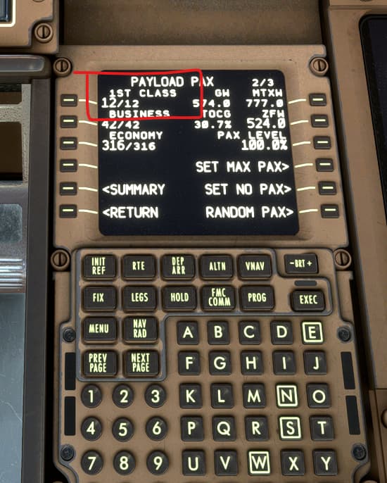 PMDG has only modeled 1 cabin which is 12 First class, 42 Business, 316 Economy for a total of 370 PAX (within the FMS). The actual modelling may differ.