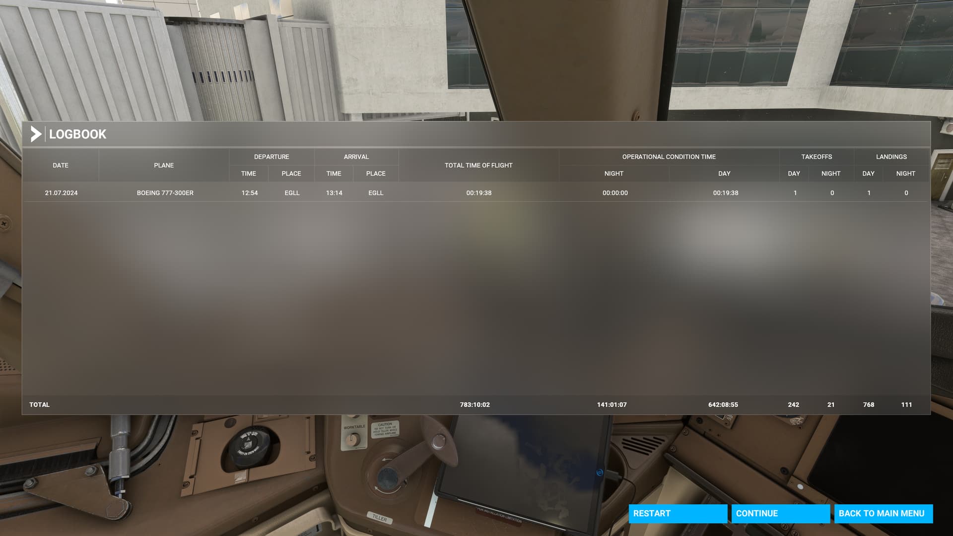 Thank you for your reply. I 've read that already somewhere, but I tried it again. Bad luck. It is strange with the logbook. I wanted to make a flight but I started the sim on the wrong airport. I closed the sim. But in my logbook is recorded a flight of 0 minutes on that airport. The airplane was the Asobo B747-8. In my logbook you can also find three flights with the PMDG B777-300ER, bit one is a VVFR flight around the airport and crashed. A flight is recorded of 7 minutes Origin; Airport A and destination vicinity of airport A. The other two flights were also from A to A and B to B. A circuit of ten minutes. After these flights something has been changed, but I don’t know what.
