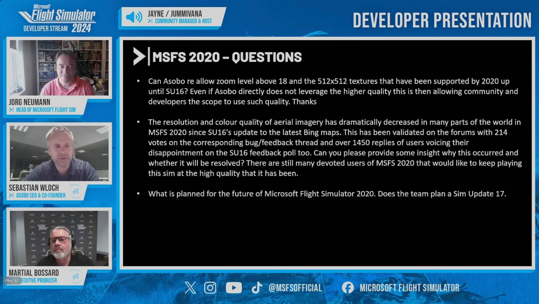 Jayne: The resolution and colour quality of aerial imagery has dramatically decreased in many parts of the world in MSFS 2020 since SU16’s update to the latest Bing maps. This has been validated on the forums with 214 votes on the corresponding bug/feedback thread and over 1450 replies of users voicing their disappointment on the SU16 feecback poll too. Can you please provide some insight why this occurred and whether it will be resolved? There are many devoted users of MSFS 2020 that would like to keep playing this sim at the high quality that it has been.
