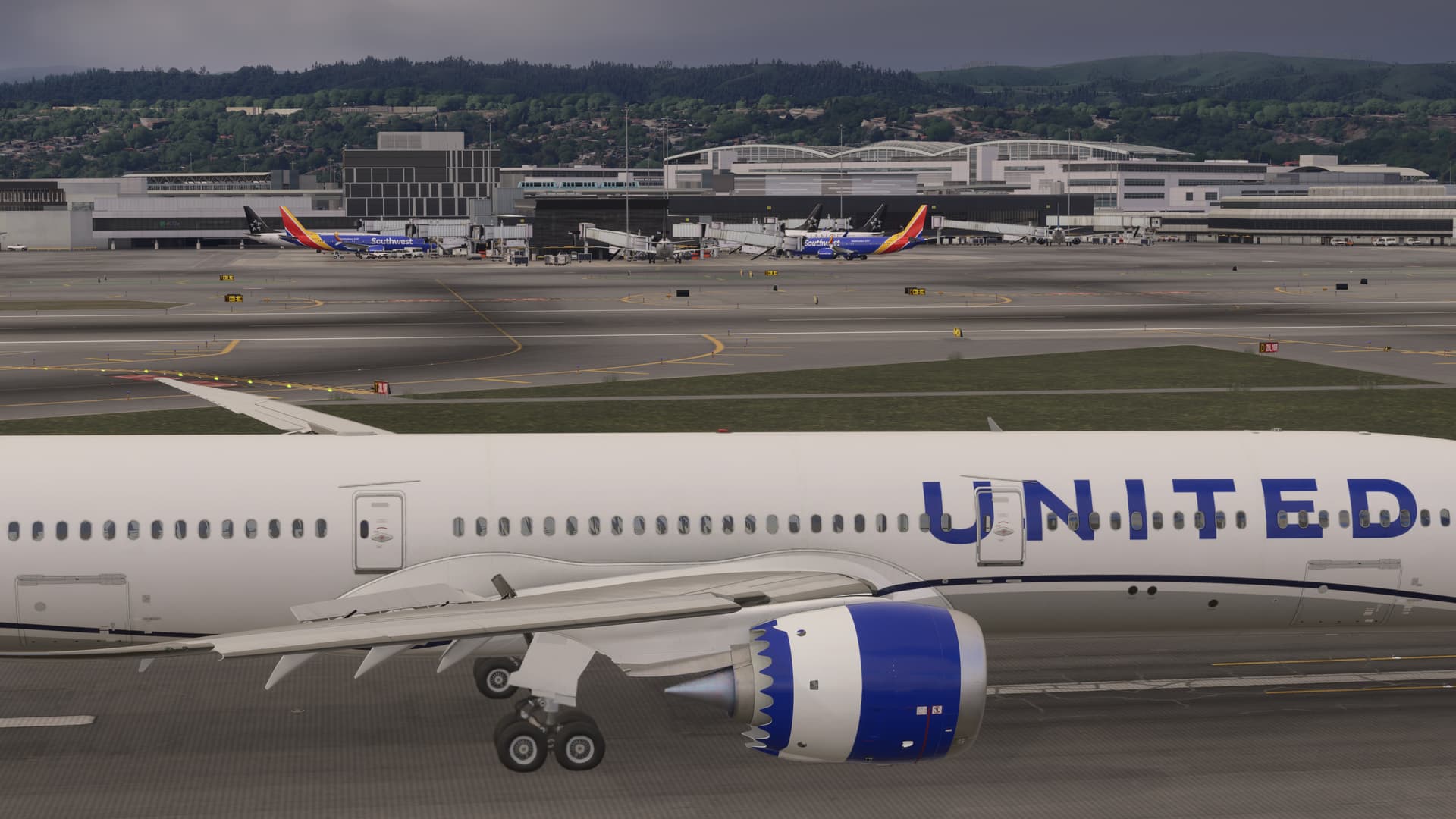 In any case pretty happy with SU3 performance. Could never do this in SU2. Here are some screen shots showing the liveries at the United Gates… contaminated with a few Southwest planes and also a nice shot on approach showing why this is called “For City”.