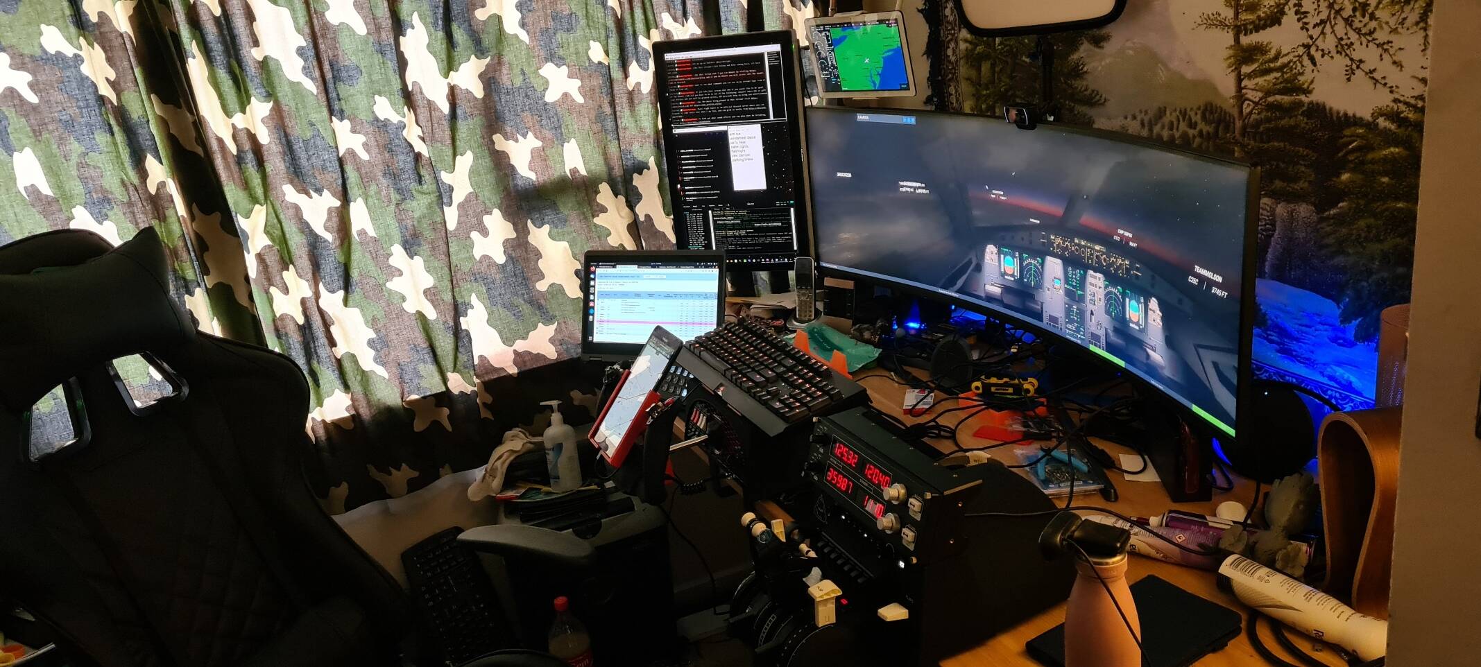 Sim PC: 3 top Monitors (no use in FS2020 atm), and center bottom. Runs the simulators.