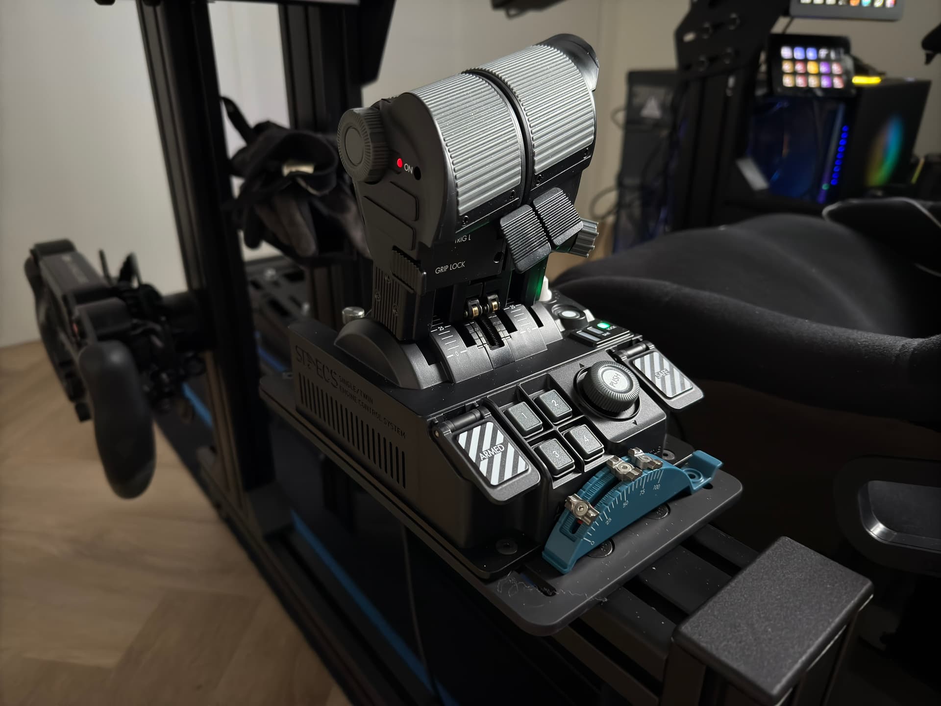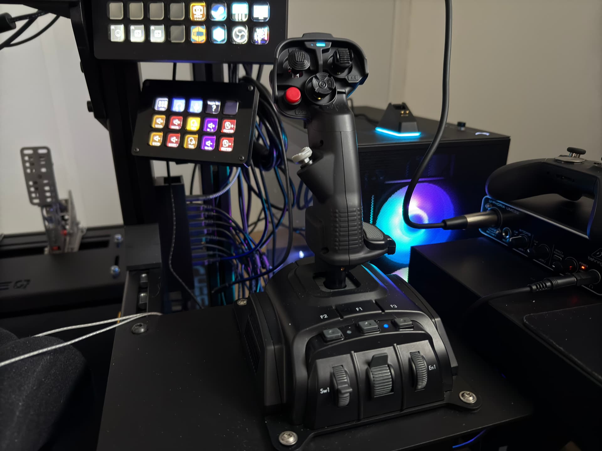 This is my FlightSim Setup. Nothing special. My goal is, I want to be able to operate any aircraft with the setup. For example, I can control combat jets and helicopters with the HOTAS, the Bravo Throttle contributes a few things like mixture control, rotor brakes on the helicopter or any spoilers or something like that, general aviation planes with the Alpha and Bravo, larger jets with the stick and the Bravo, etc.