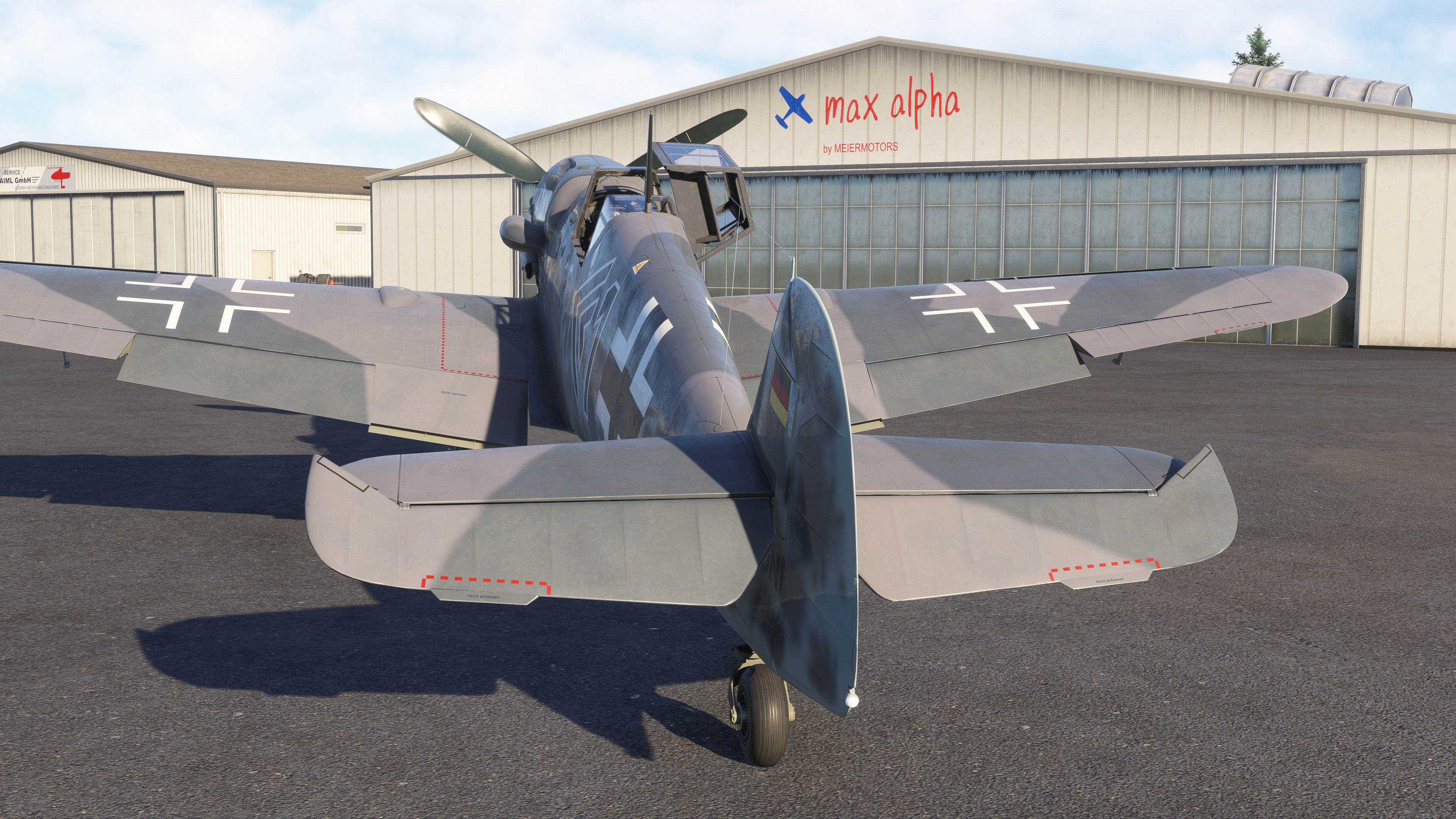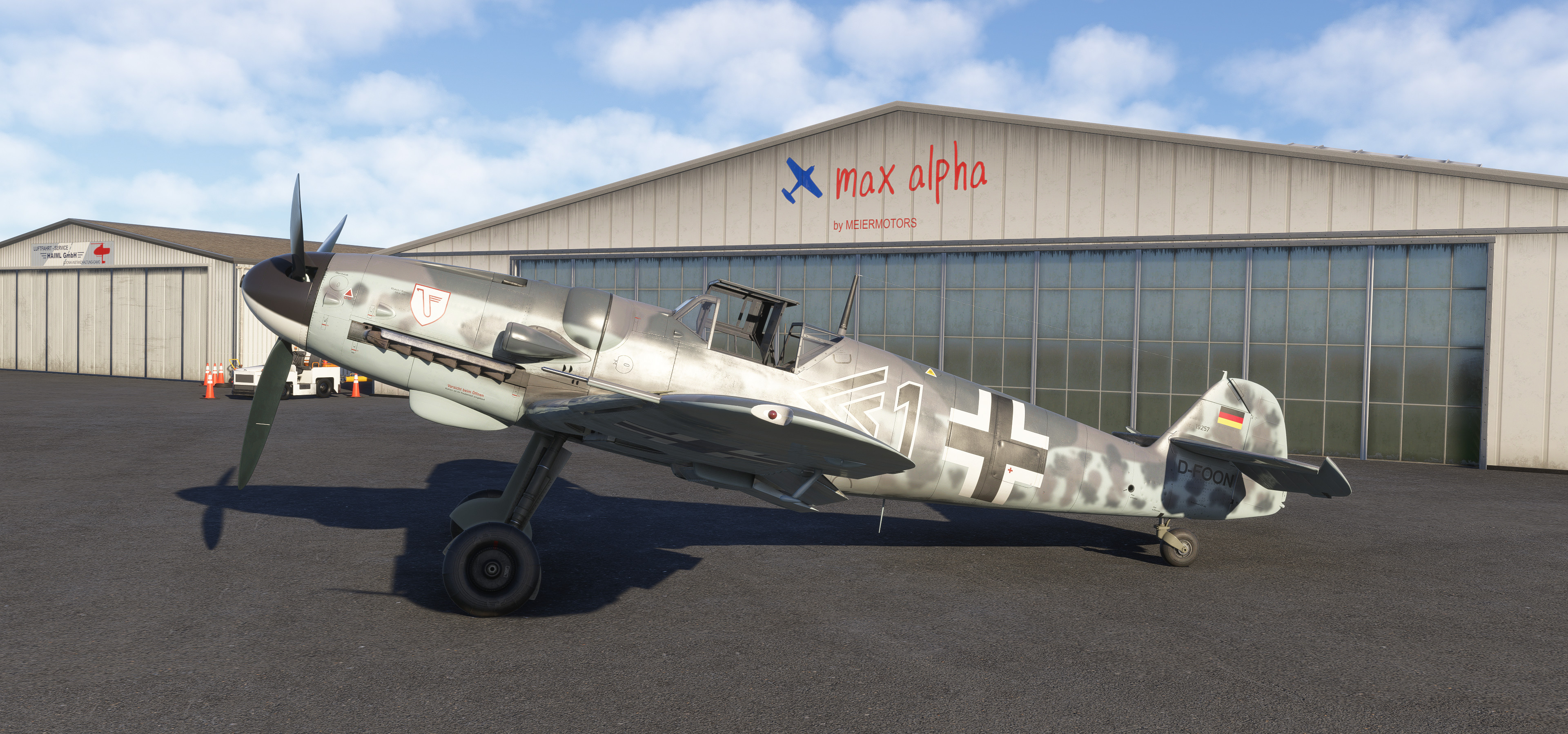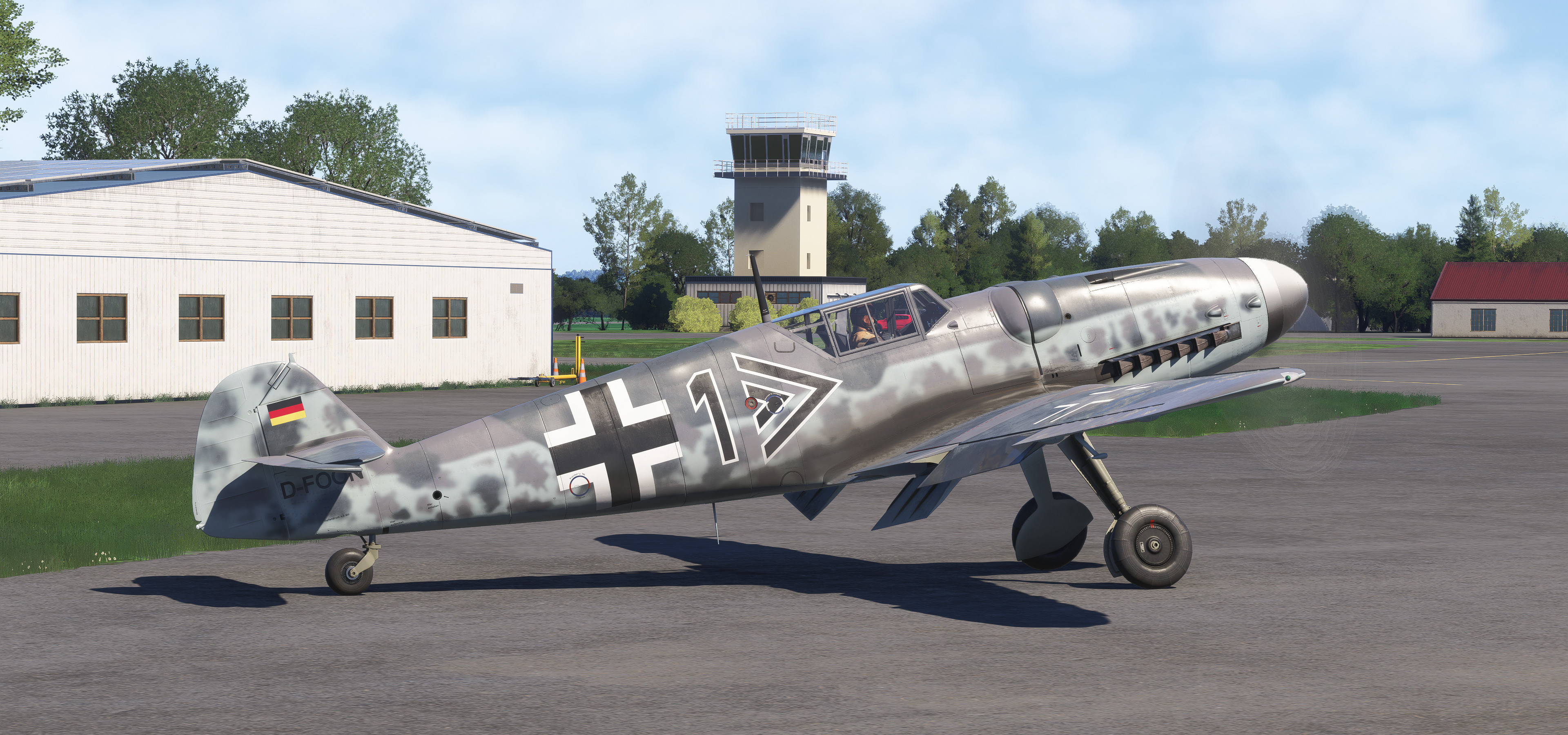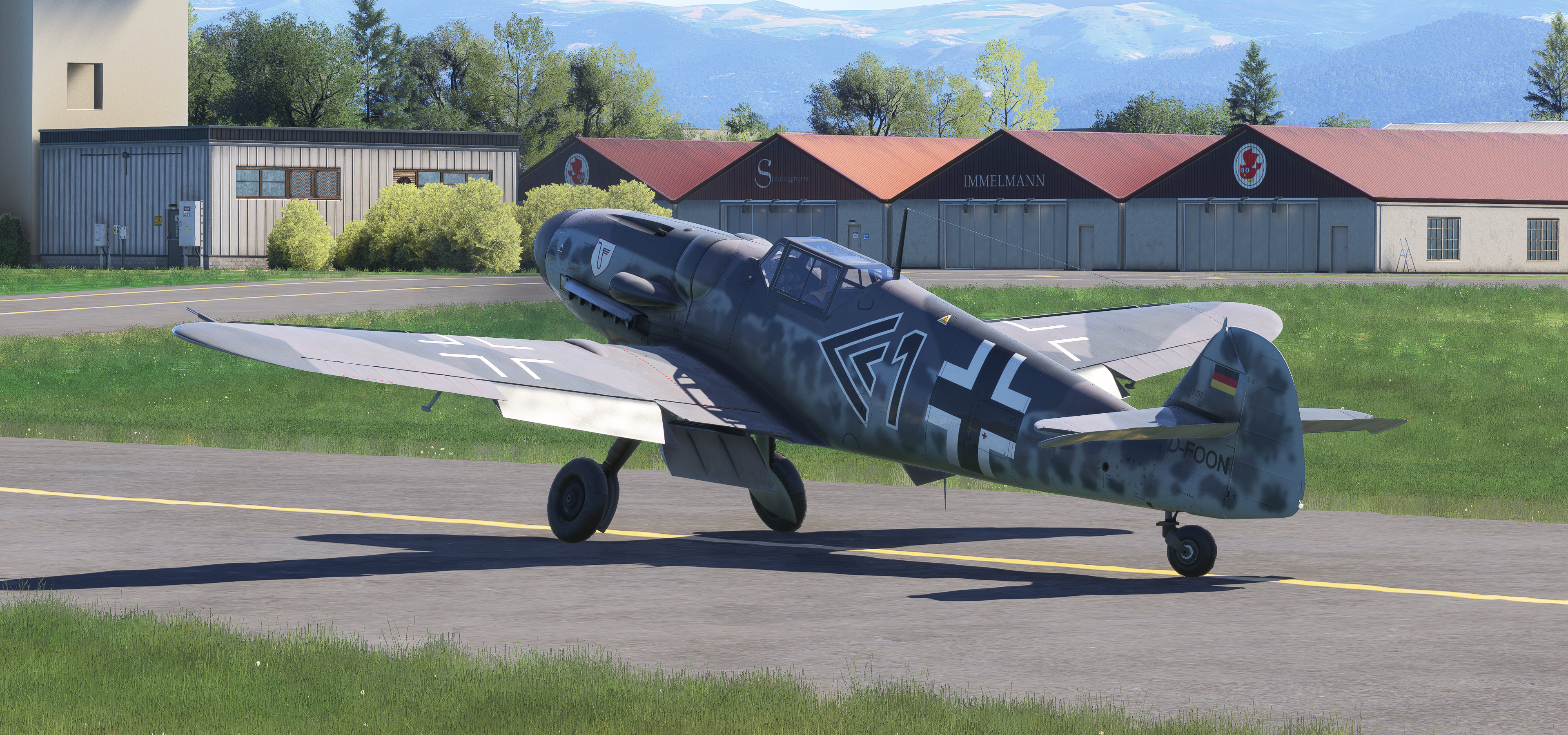 EDTG Bremgarten Airport is one of the well over one thousand default GA airports in MSFS 2024 that are hand-crafted, with numerous custom-made hangars and hand-placed static objects, but that of which are not indicated as being hand-crafted from the menu. Real-life Bremgarten is home to MeierMotors/Max Alpha Aviation, which has been responsible for numerous warbird restorations including several Bf 109s, Flug Werk Fw 190s, P-51 Mustangs, Yak fighters, Sea Furies, a Corsair and more. This completely default version of Bremgarten Airport in MSFS 2024 features accurately-made hangars and signage, very, very closely matching the real airport. The Bf 109G ‘D-FOON’ (converted Buchon), as seen depicted in these screenshots, is one of the Bf 109s restored/rebuilt by MeierMotors at Bremgarten, and did all of its test flying there before it was shipped to the US (where it now flies in Virginia, as N109GY).