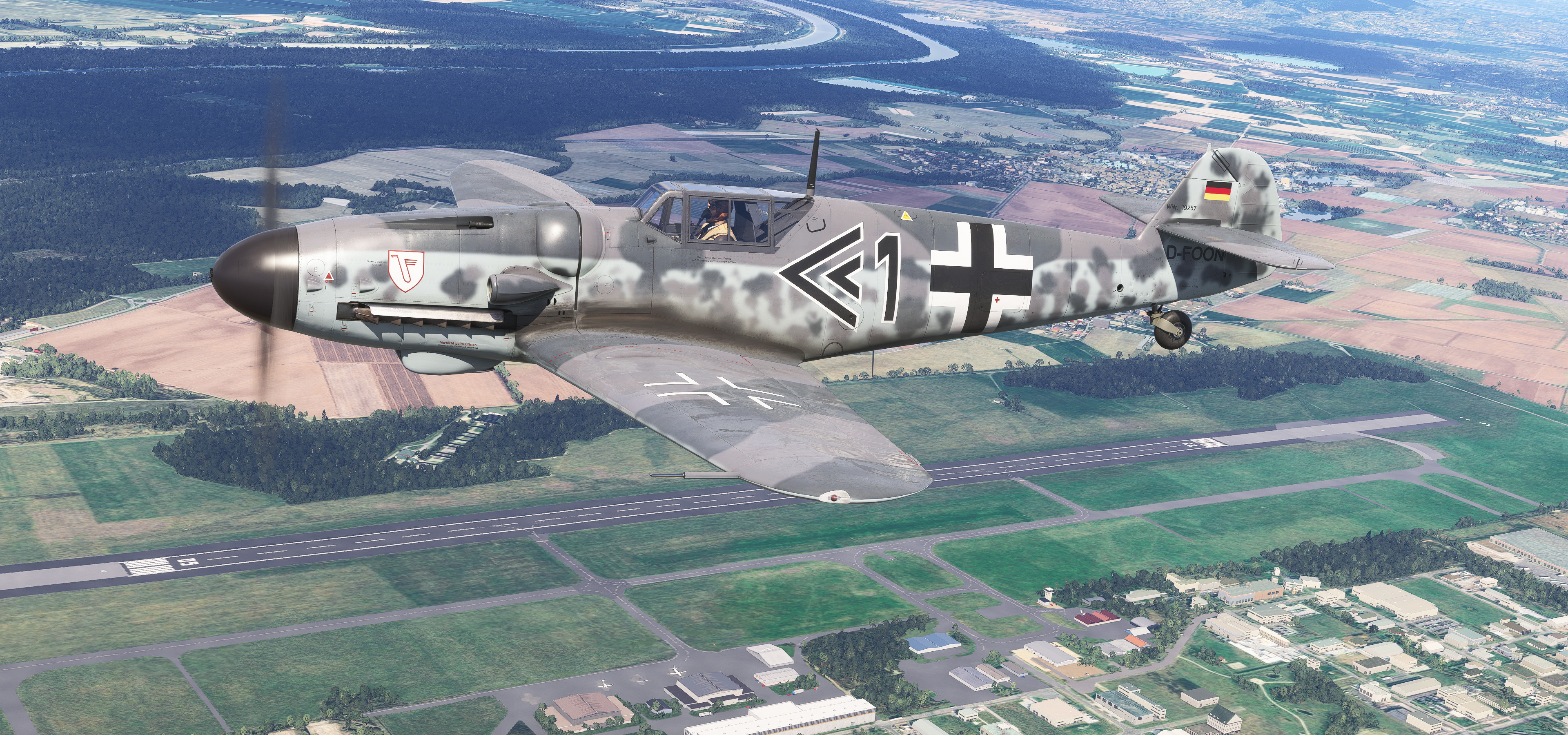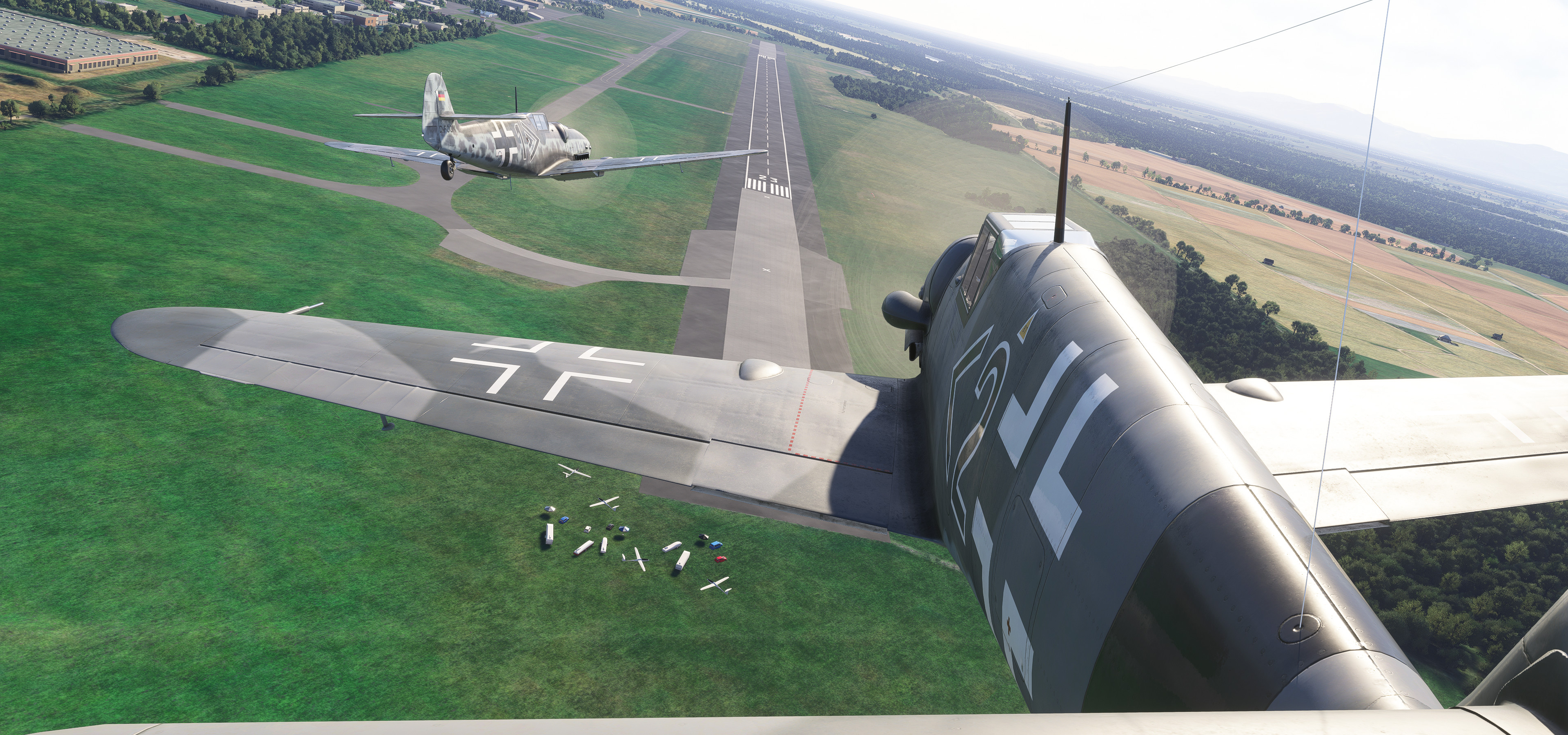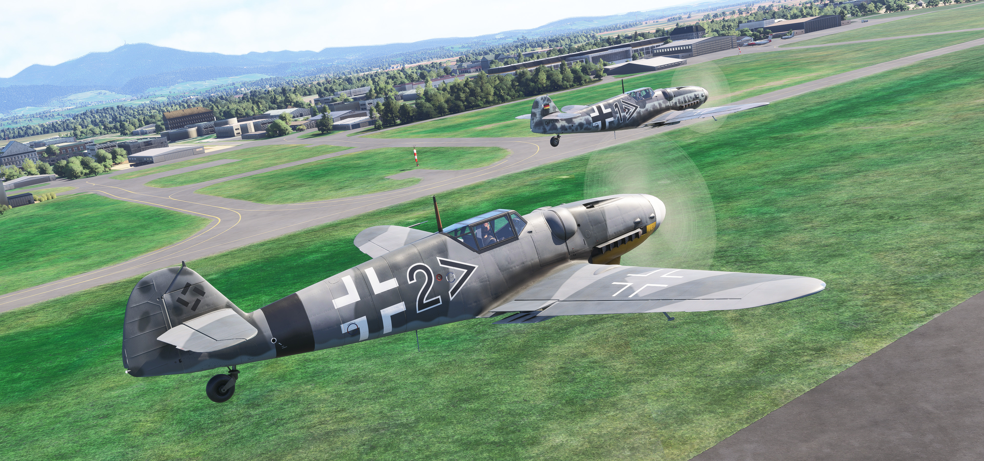 EDTG Bremgarten Airport is one of the well over one thousand default GA airports in MSFS 2024 that are hand-crafted, with numerous custom-made hangars and hand-placed static objects, but that of which are not indicated as being hand-crafted from the menu. Real-life Bremgarten is home to MeierMotors/Max Alpha Aviation, which has been responsible for numerous warbird restorations including several Bf 109s, Flug Werk Fw 190s, P-51 Mustangs, Yak fighters, Sea Furies, a Corsair and more. This completely default version of Bremgarten Airport in MSFS 2024 features accurately-made hangars and signage, very, very closely matching the real airport. The Bf 109G ‘D-FOON’ (converted Buchon), as seen depicted in these screenshots, is one of the Bf 109s restored/rebuilt by MeierMotors at Bremgarten, and did all of its test flying there before it was shipped to the US (where it now flies in Virginia, as N109GY).