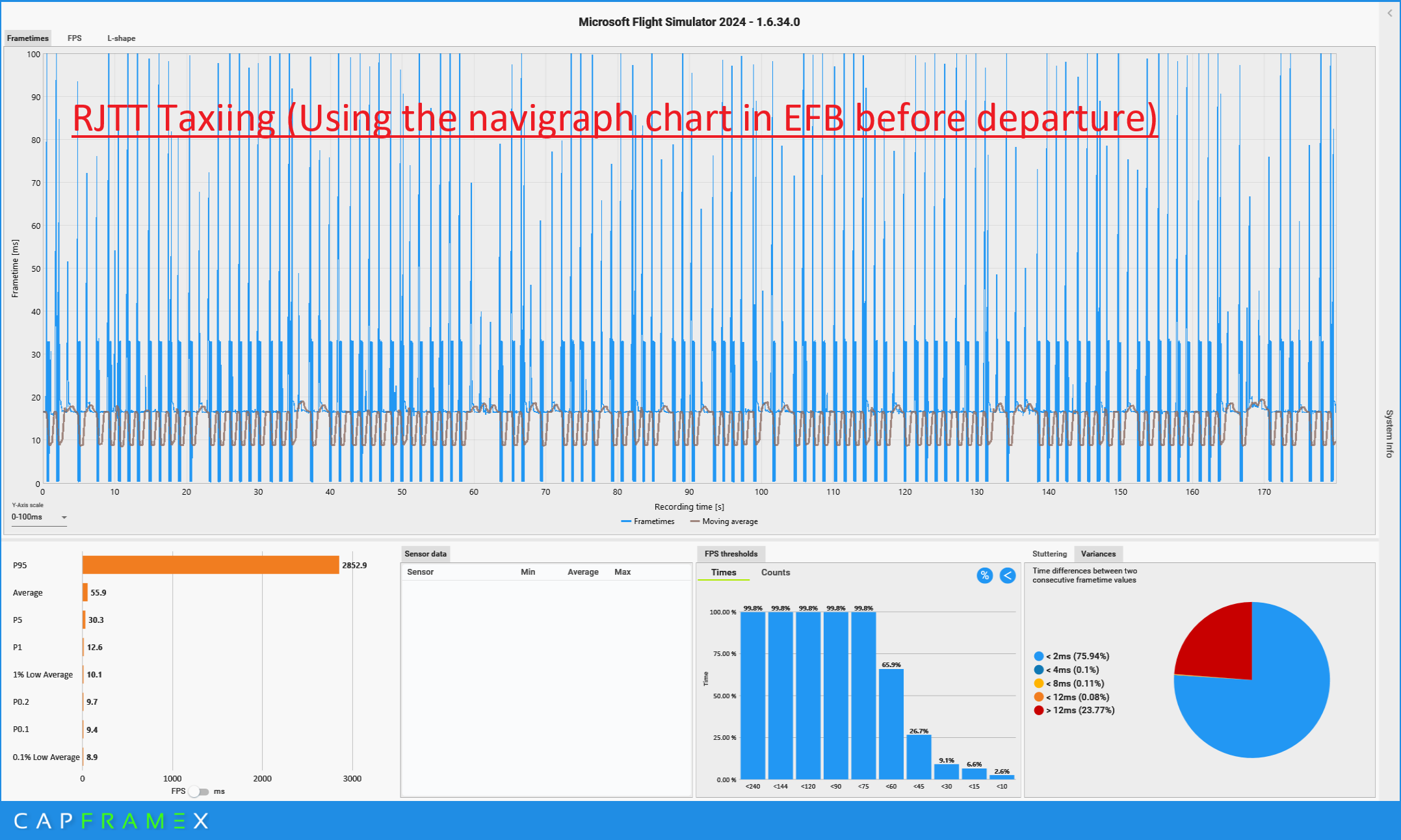 Post-Flight Data: While stutters are naturally not visible when stationary, capturing data with CapFrameX after a flight while parked reveals that the rendering process is periodically breaking down.