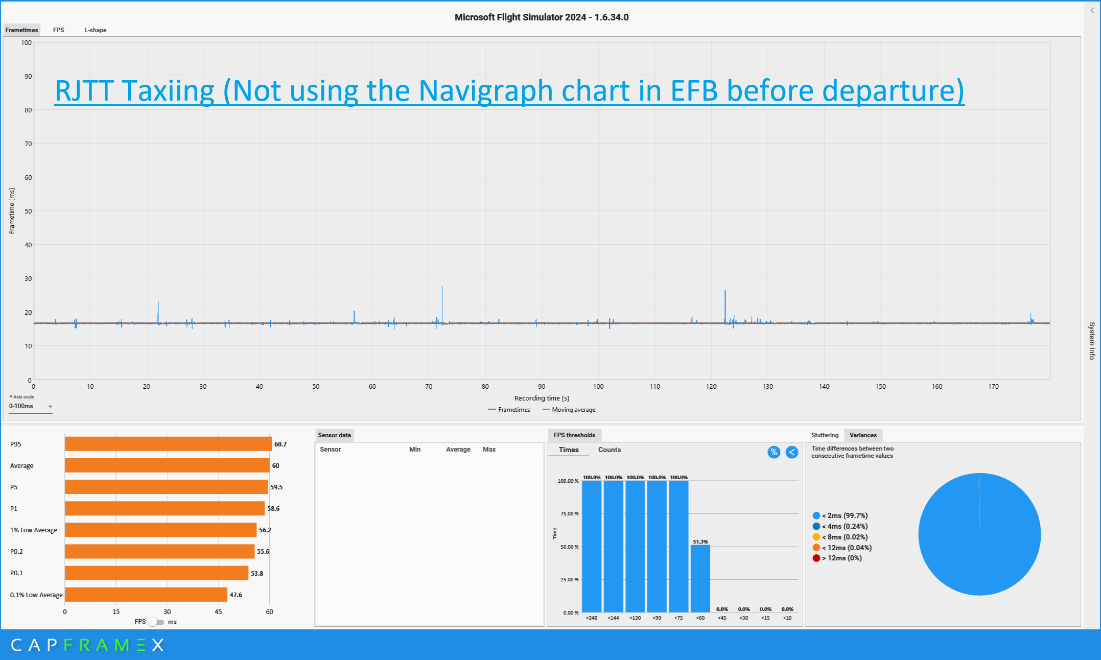 For your reference, I am sharing the frame time data captured during taxiing after landing, following a 1.5-hour flight from RJCC (New Chitose) to RJTT (Haneda).