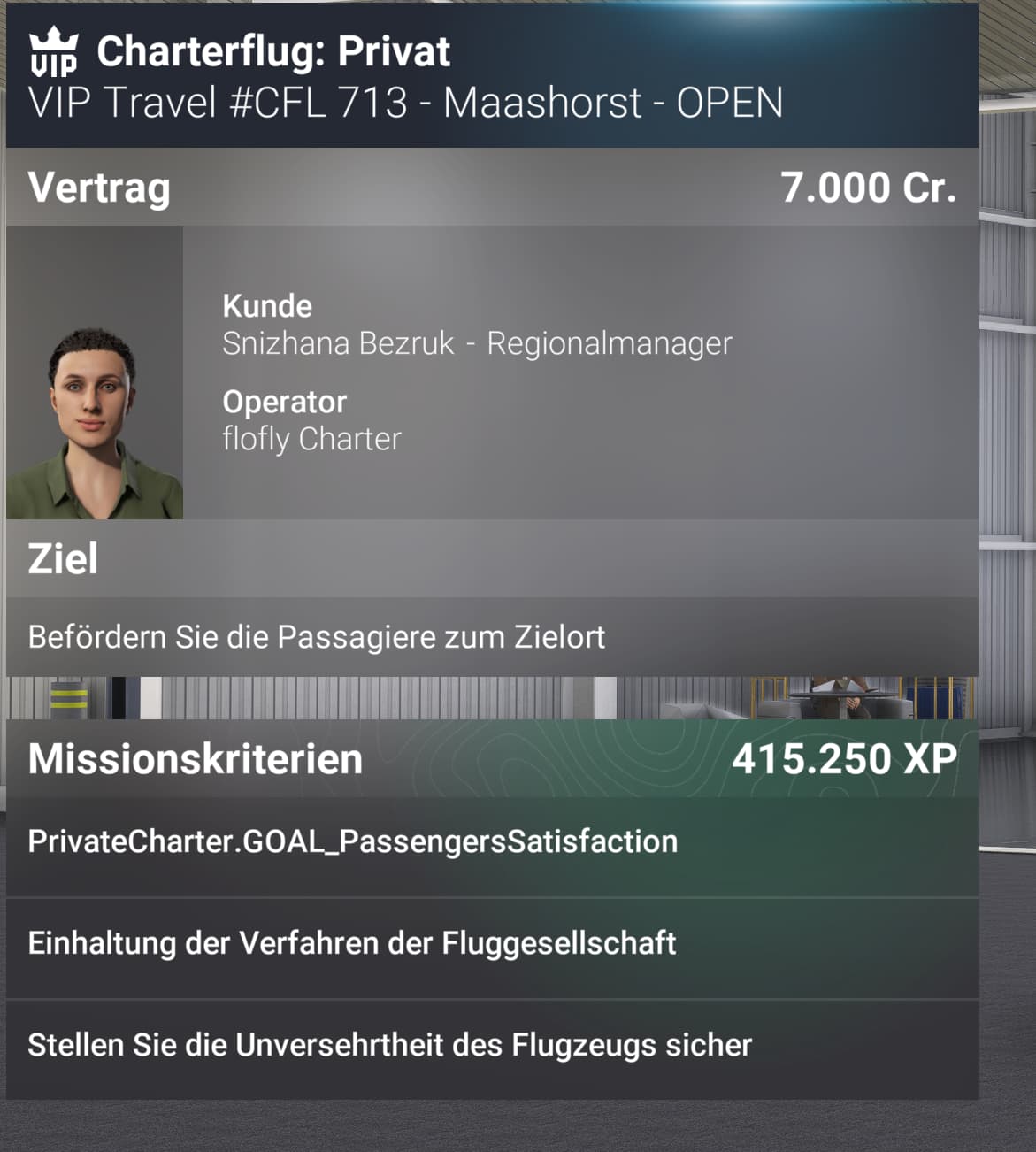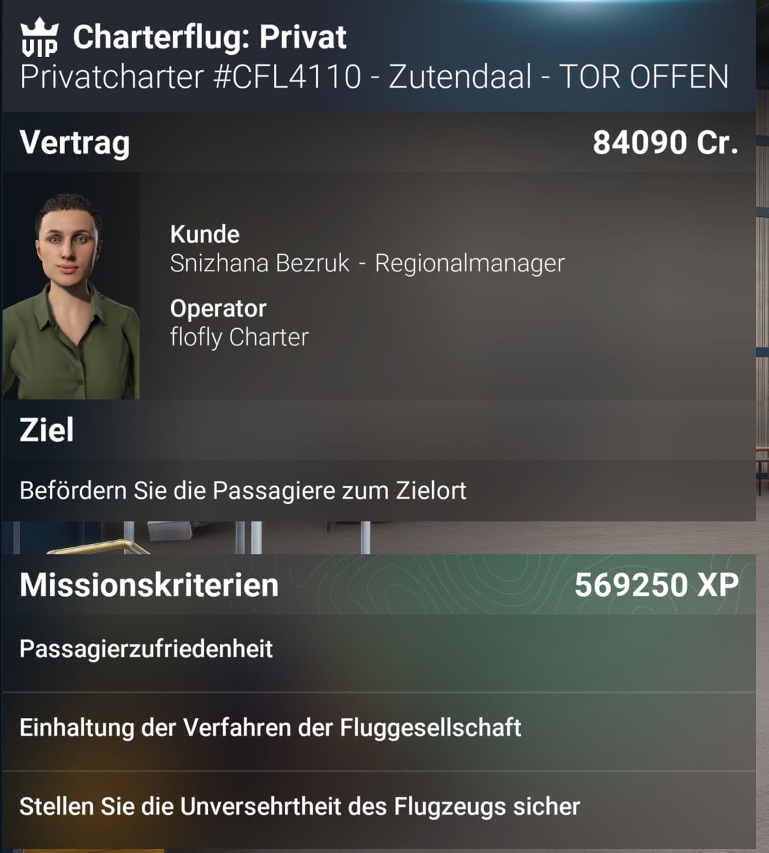 Description of the issue: In career mode when running a charter flight the mission criterium states “PrivateCharter.GOAL_PassengerSatisfaction” instead of a sensible German sentence.