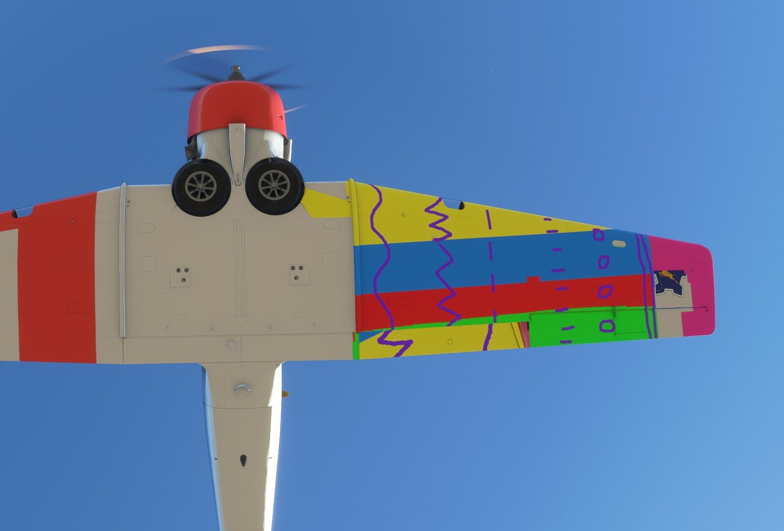 For some reason, a portion of the texture for the trailing edge of the underside of the left wing is being swapped around with a portion of the leading edge texture. I thought I was doing something wrong with my painting or export at first, but after inspecting the default Asobo liveries, it seems the default planes have the same error, but it’s not as noticeable because all their wings are solid colours and there is a decal that is placed over the wing texture which hides the defect somewhat.