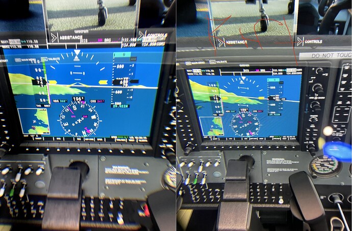 I returned my G2. I could not get over how small the sweet spot was coming from my Rift S. The center is crazy clear, but the outer part of it is almost vomit-inducing blurry. If you glance down at your gauges, it is terrible. I had to resize this image down a lot, but you can see the blurry on the left around the airspeed indicator, yoke, etc. The rift s on the right is no where near as clear, you can see the pixel pattern, but it is consistent all across the lens up to the very edge where it curves out.