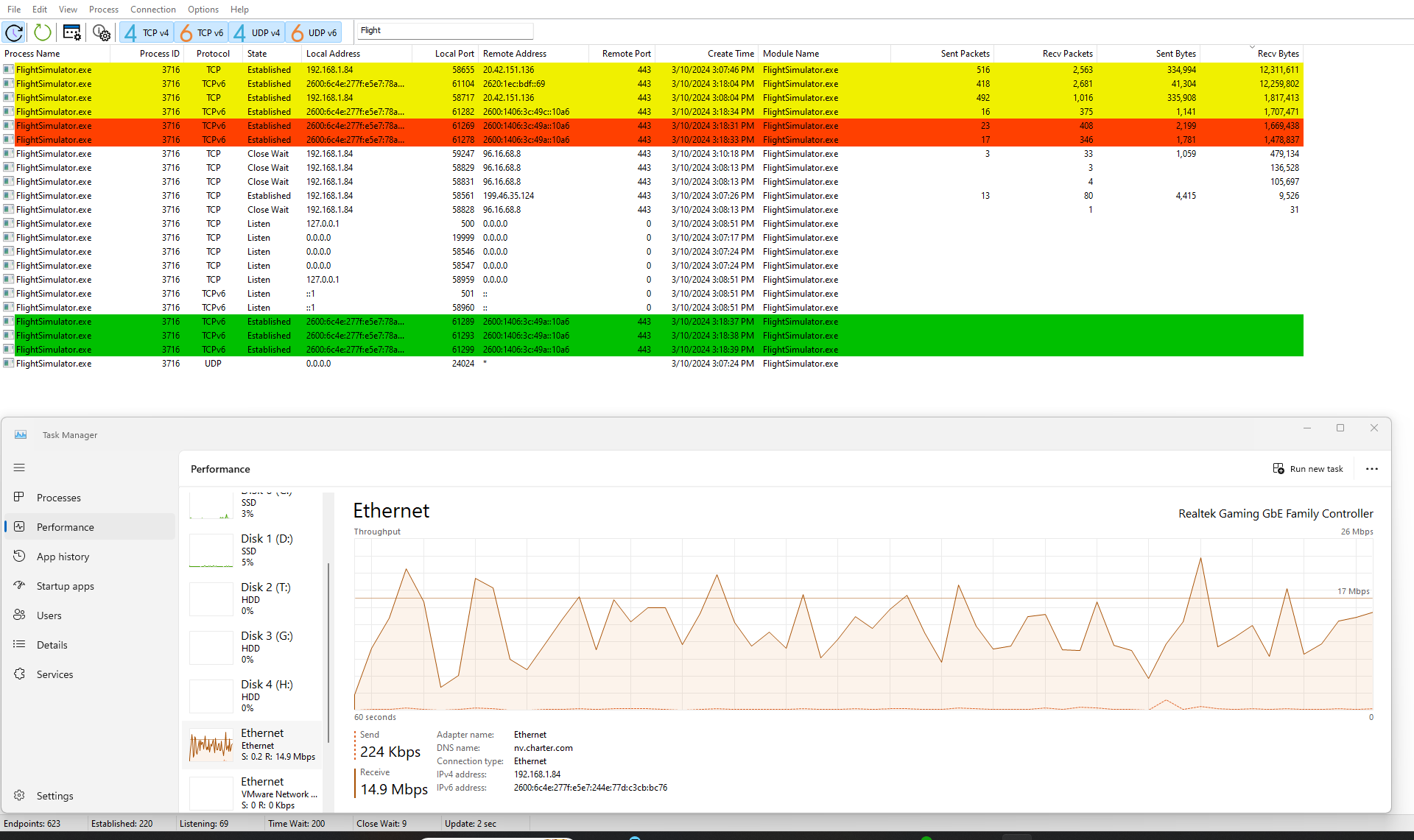 I also forgot to mention that just because you have a 60mb or a 1gb link, does not mean you’ll be able to get downloads at the higher speed of 1gb/sec. Download speeds are controlled by the server, your ISP does limit your traffic to 60mb/sec, but that should be fine as shown below. A faster internet speed will provide more bandwidth for more users. If you’re going to upgrade to a higher speed, 100-200mb would be fine. The most I’ve seen from the FS servers when downloading an update was 212mb/sec for a very short period of time, average for me is around 120mb/sec. But when you’re flying, there’s not that much data being downloaded. Here’s 2 snap shots of a flight from LA to SFO, the top is 0 to 5 minutes into the flight and the bottom one is 15 minutes into the flight. Also, If servers are busy with a lot of active connections, it’ll slow down the amount data for each connection. Another factor is how busy the CPU is on the server and there are other factors will affect how fast it can respond to the users. (And multiply the number of Bytes by 8 to get the number of bits..)