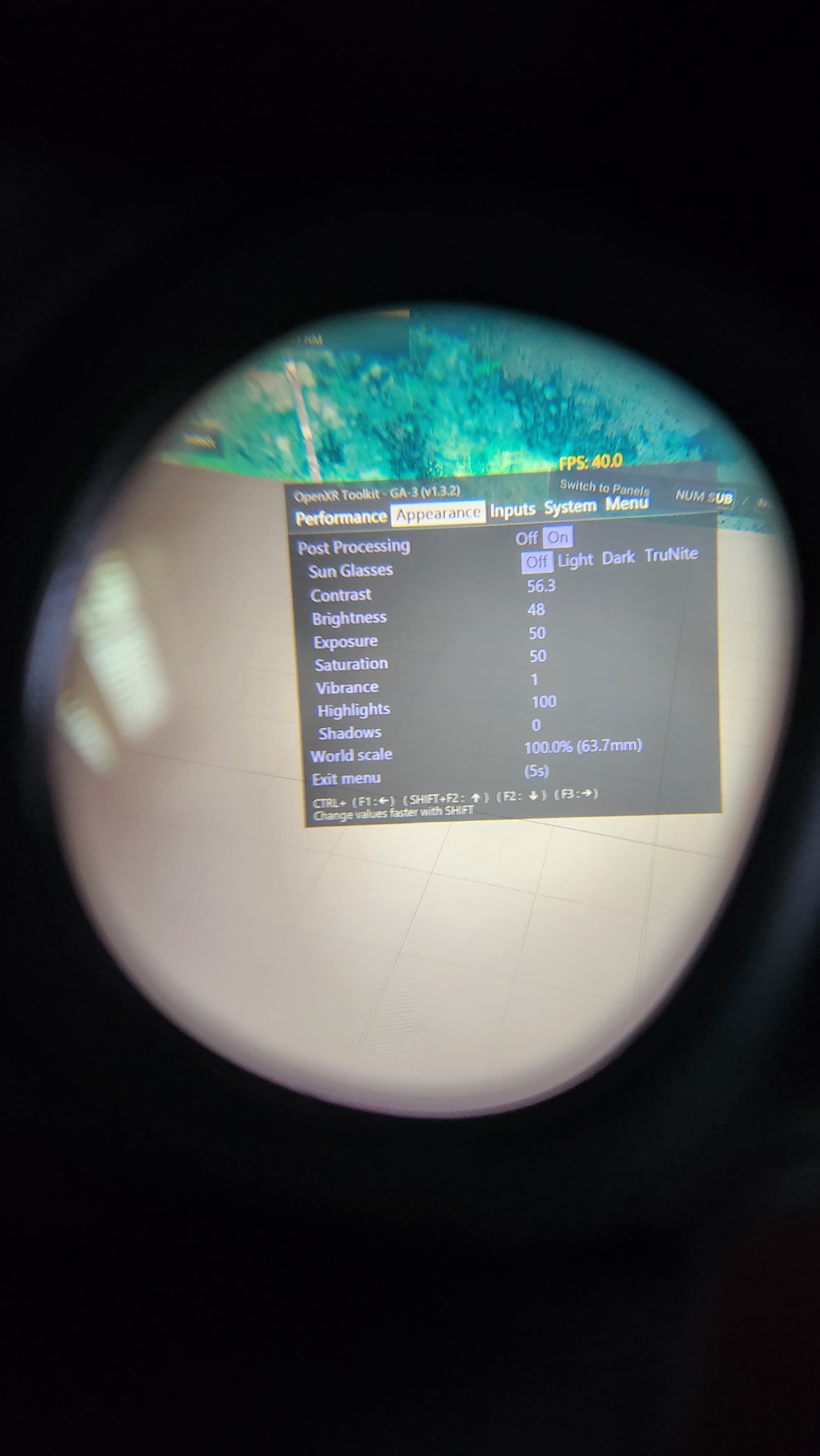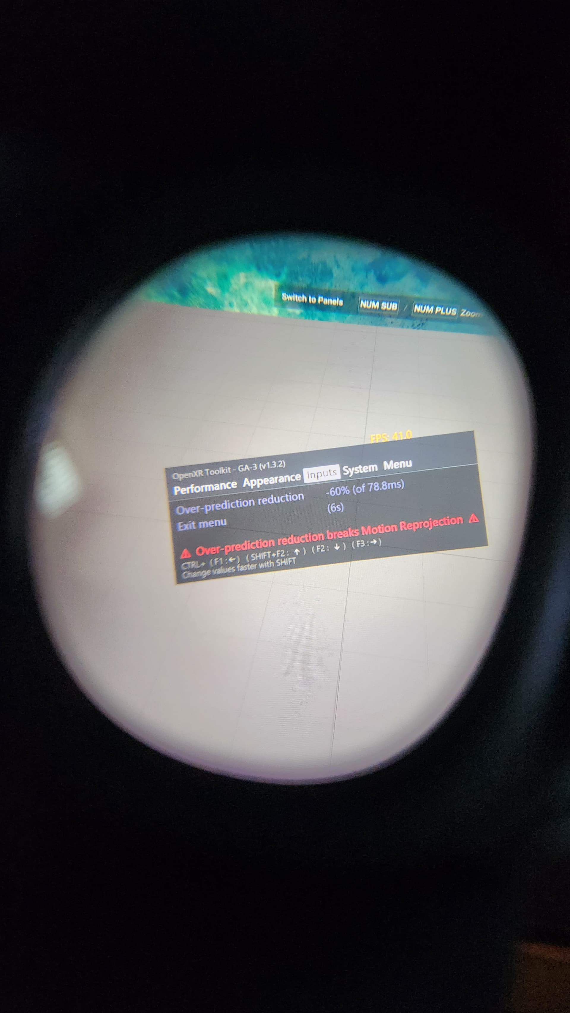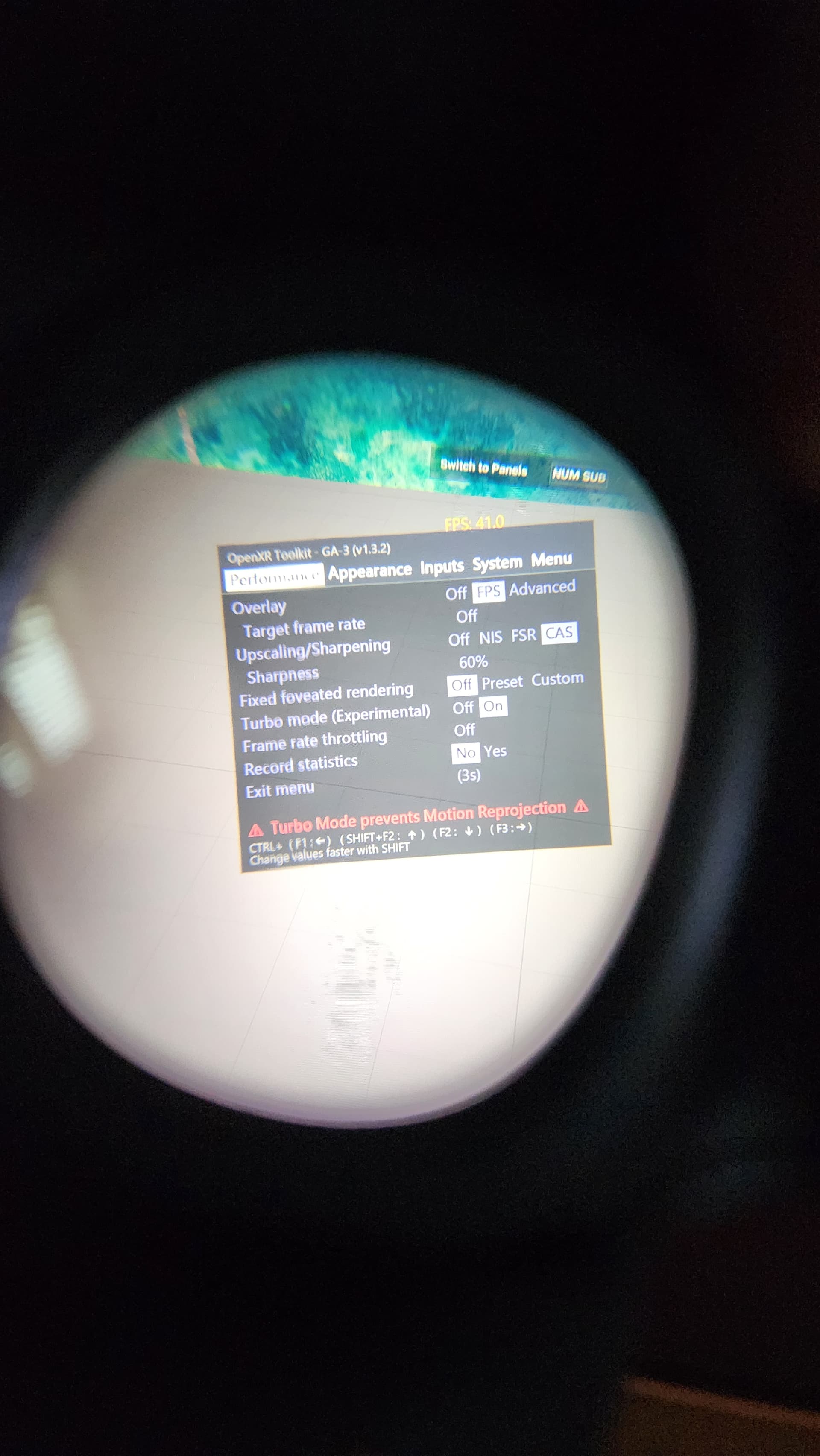 With Virtual Desktop SSW enabled always, you are effectively forcing 40fps at 80Hz… so that’s not real performance but limited performance with motion reprojection. On top of that the Toolkit Turbo mode is incompatible with SSW and breaks Motion reprojection. You are running Dynamic Settings, which basically adjust TLOD OLOD and such to hit a desired frame rate. I can’t see what you target, but I’d assume 40fps given SSW and 80Hz on HMD. On top of that you run a Crop, which reduces FOV, but oversample with Ohne’s Mod. It is highly subjective if that gives a better solution of Less FOV and supersampling in that narrow FOV. Then you run an over-prediction of -60% which can be very swimmy for many people. I also see you screenshot V1.3.2 and V1.3.8 OpenXR toolkit software which is confusing, but I hope the settings are the same.