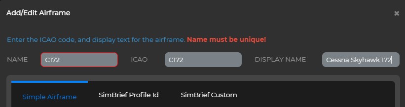 Easy fix, right? Just add my aircraft! Well no, for GA aircraft it does not seem as simple as I expected. I was flying the C172 (steam gauges) which is not listed, so I gave up and flew without adding an aircraft. Tracking was OK and landing data was logged, but no hours or logbook entry.