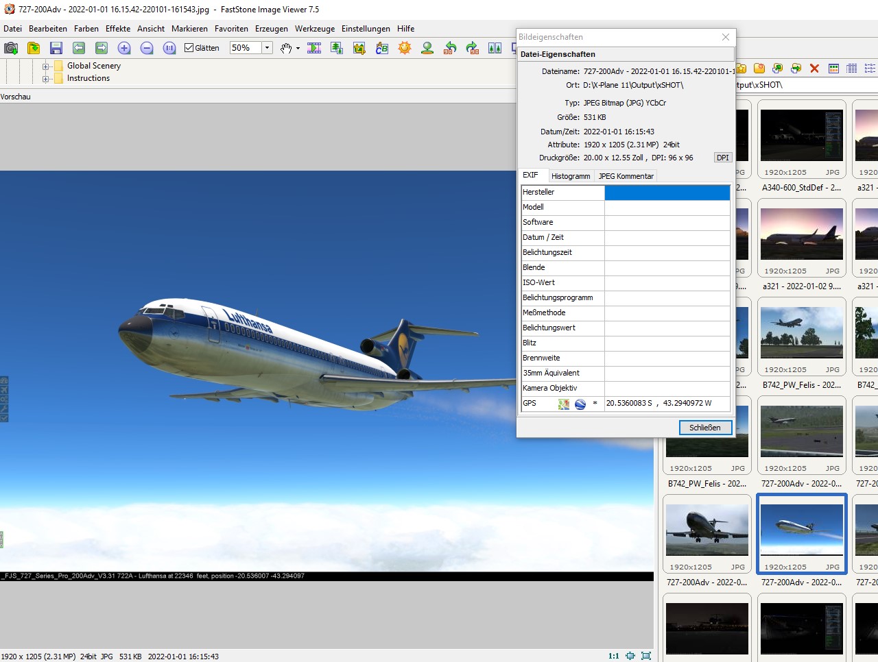 The “photos” are (psssst!) X-Plane screenshots and I make them with the support of xShot, a tiny tool, which automatically geotags them with the position as Lat/Lon in the images EXIF data. See an example of a screenshot with the embedded EXIF geotag below.