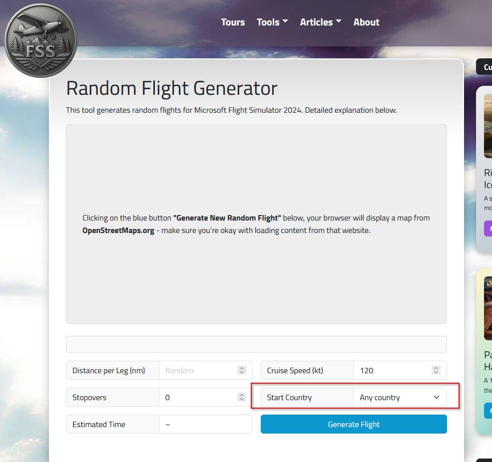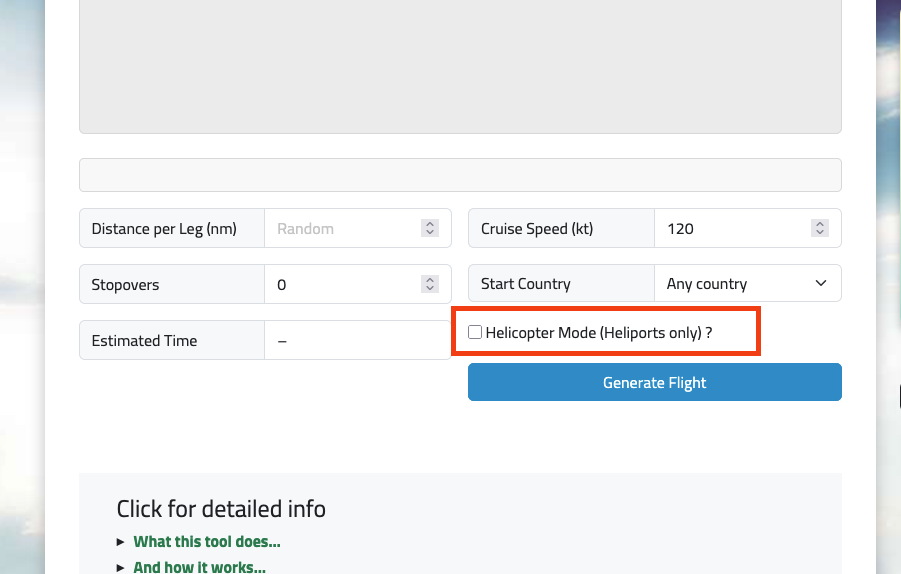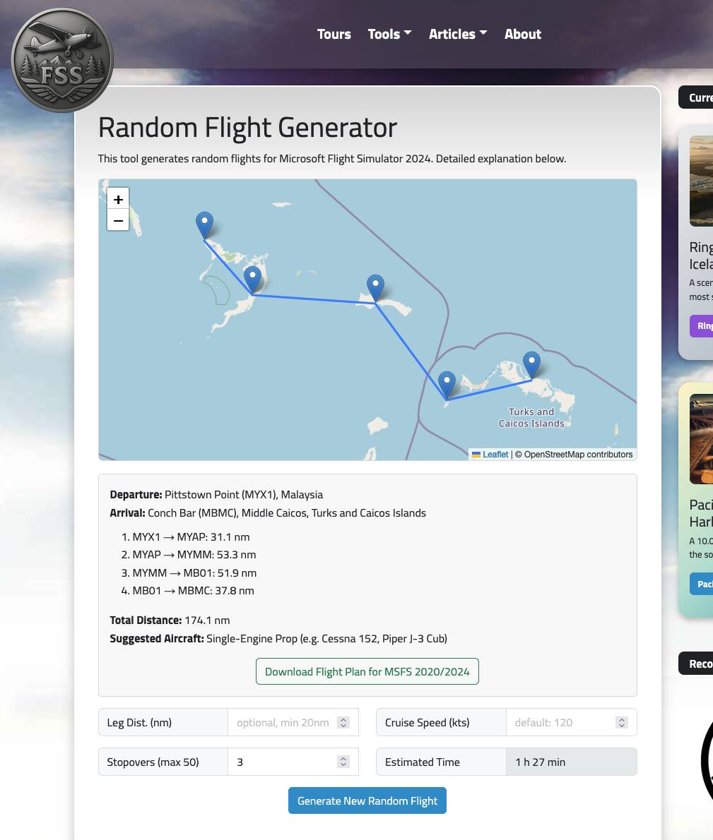 I created a little Random Flight Generator which uses the airport data from MSFS 2024. It’s a web based tool with the option to download a flight plan and adjust some settings without compromising the “randomness factor”.