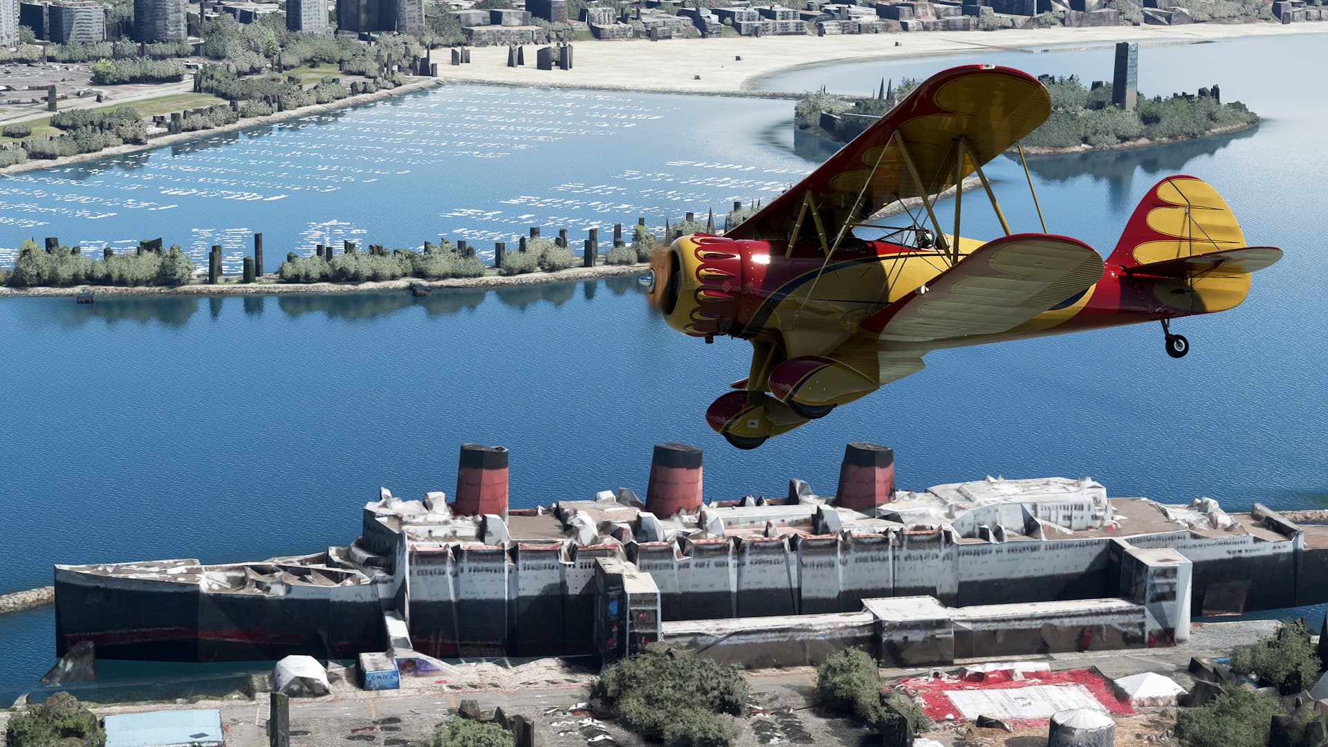 Flying over the Queen Mary. Last time I saw this ship it was covered in trees, so I guess they fixed it at some point.