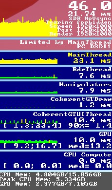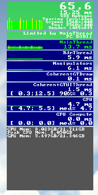 There is a regular CPU spike in the main thread that eventually kills performance. When first starting the game, this is not really apparent (see top attached picture, taken at the menu screen). After loading at an airport - even if only for a minute or two and not flying anywhere - the CPU spikes become more apparent (see second attached picture - the first plane loaded). When returning the menu, the CPU spikes remain (see third attached picture), so clearly they are not directly related to loading/displaying planes or scenery. When loading another plane, the spikes get worse (see fourth attached picture; note this can really be any plane); they are now actively visible as stutters when playing. When returning to the menu, the bad spikes are still present (see bottom attached picture) and the stutters are apparent even in the menu. The spikes are regularly timed, i.e. the gap between them is invariably the same in time, and they move faster on the display when the framerate is faster.