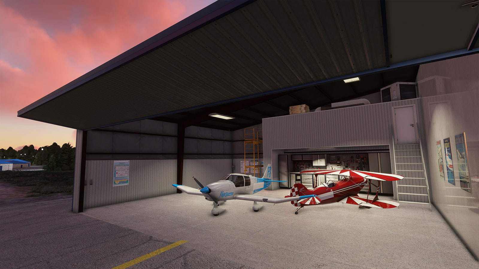 - 4 Open hangars with interior modeling and starting spots. Select “W Parking 1” to spawn inside a large hangar suitable for business aviation and larger GA aircraft, or select “E Parking 1/2/3” to start in one of the smaller GA hangars