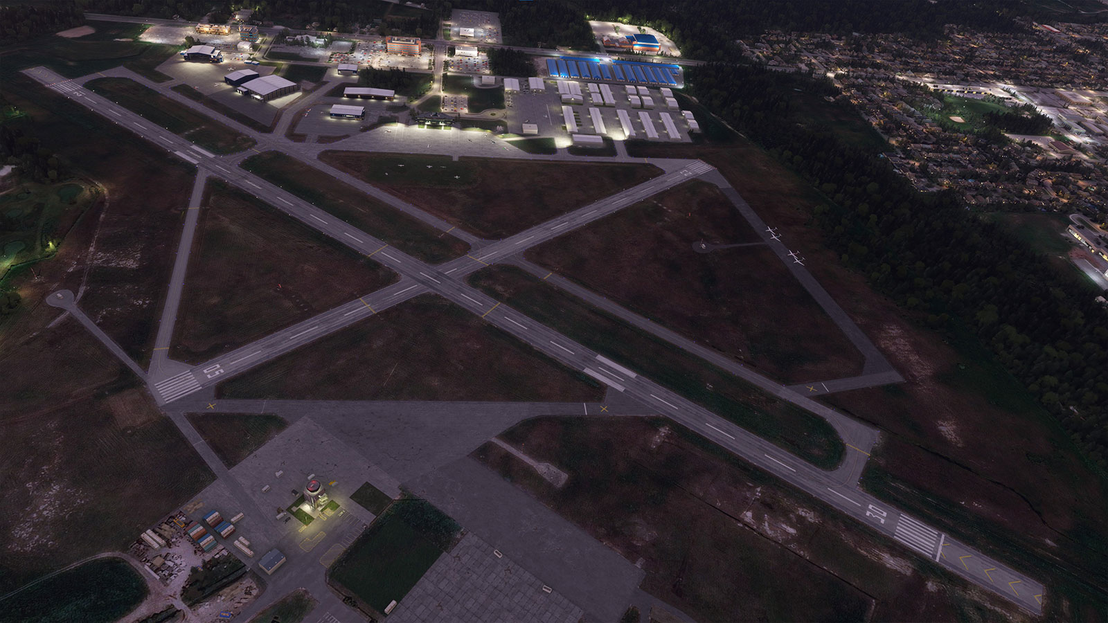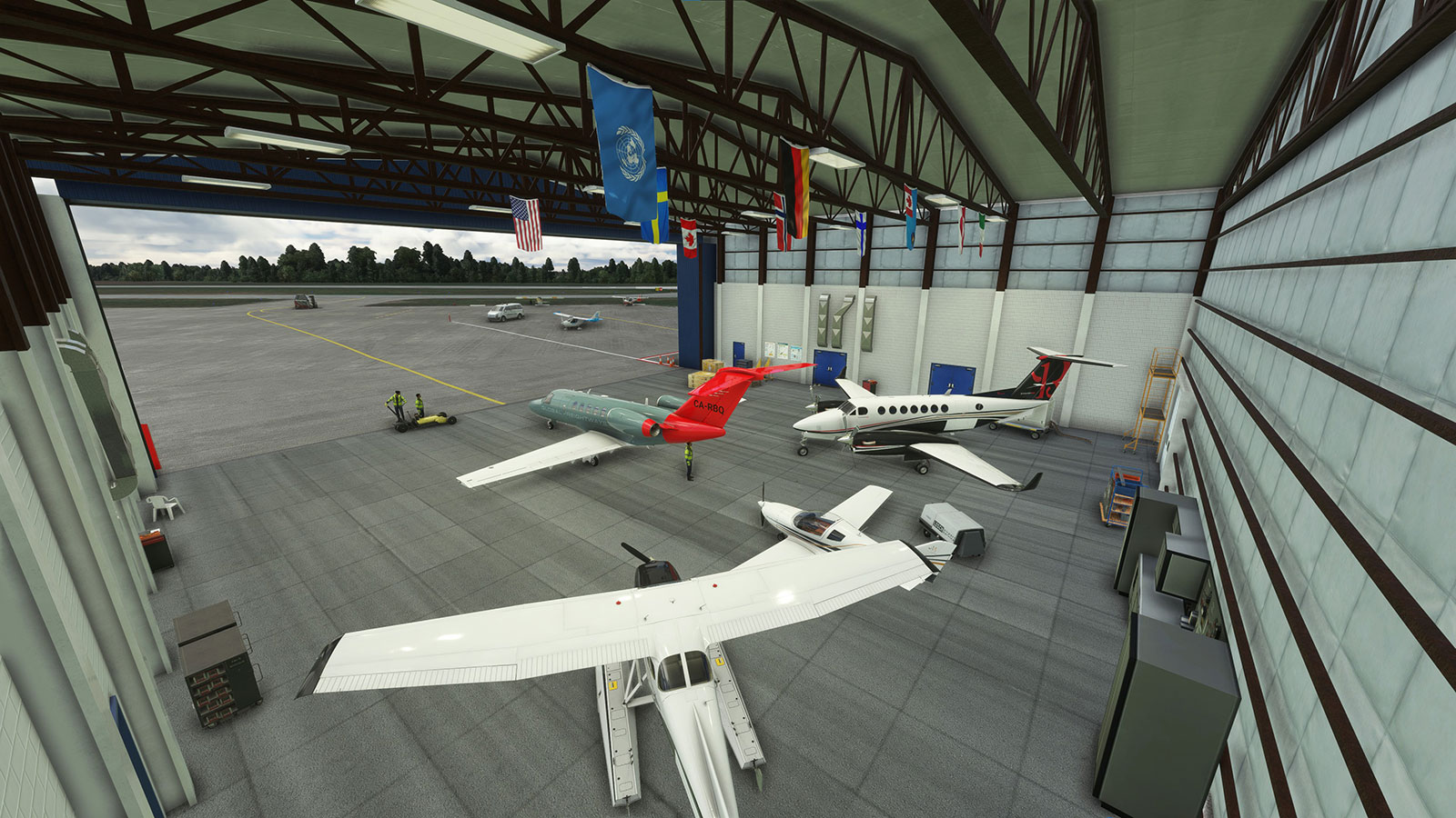 Advanced 3D modeling and innovative features let you start your flight in one of 4 open hangars with interior modeling and parking spots. Both runways are sloped true to life and have custom pavement and hand-painted Canadian striped markings. All models are meticulously hand-crafted based on an extensive scouting and flying in the area, producing photos and videos of all approaches and ground facilities. Custom PBR materials and detailed modeling are used throughout the area. Several static aircraft are included, and plenty of real-life and dynamically populated parking sports are there for you.