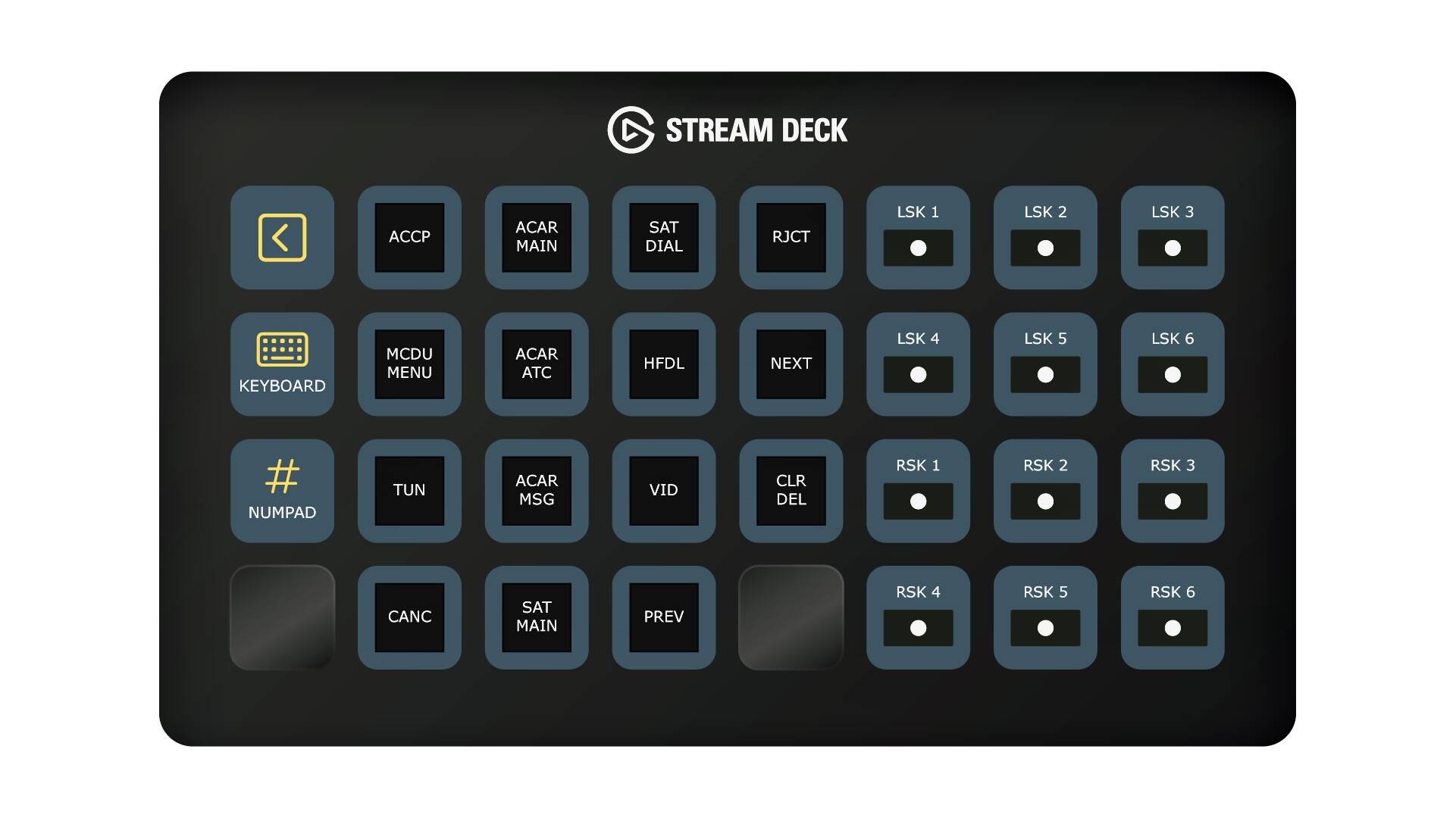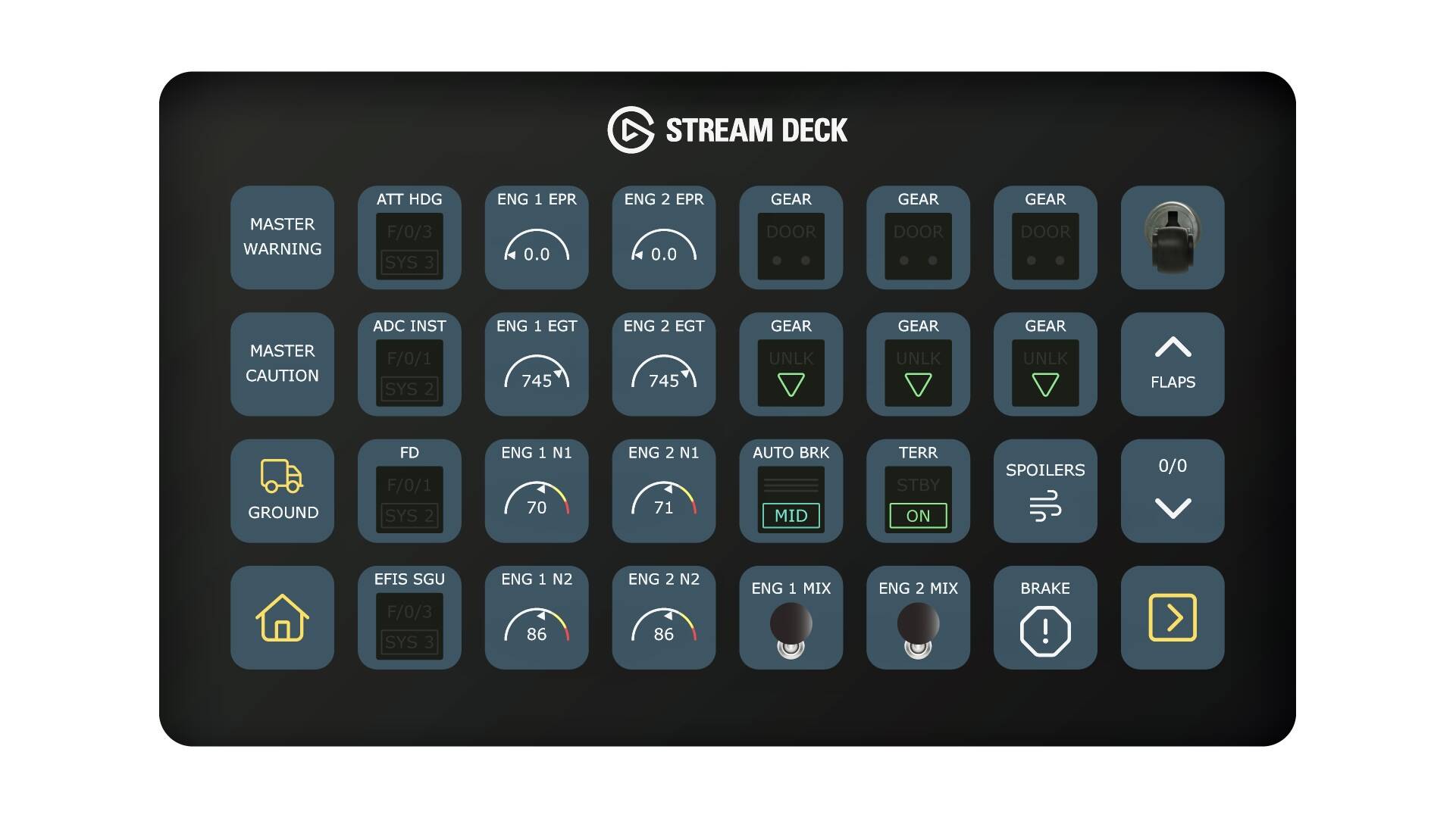 With over 535 custom designed buttons across 21 pages (or 53 pages on 15 key devices!), this exceptionally detailed and meticulously crafted Stream Deck Profile allows you to control your A300-600’s cockpit buttons, dials and switches directly from your Stream Deck XL, Classic, MK.2 and/or Stream Deck Mobile for iPadOS.