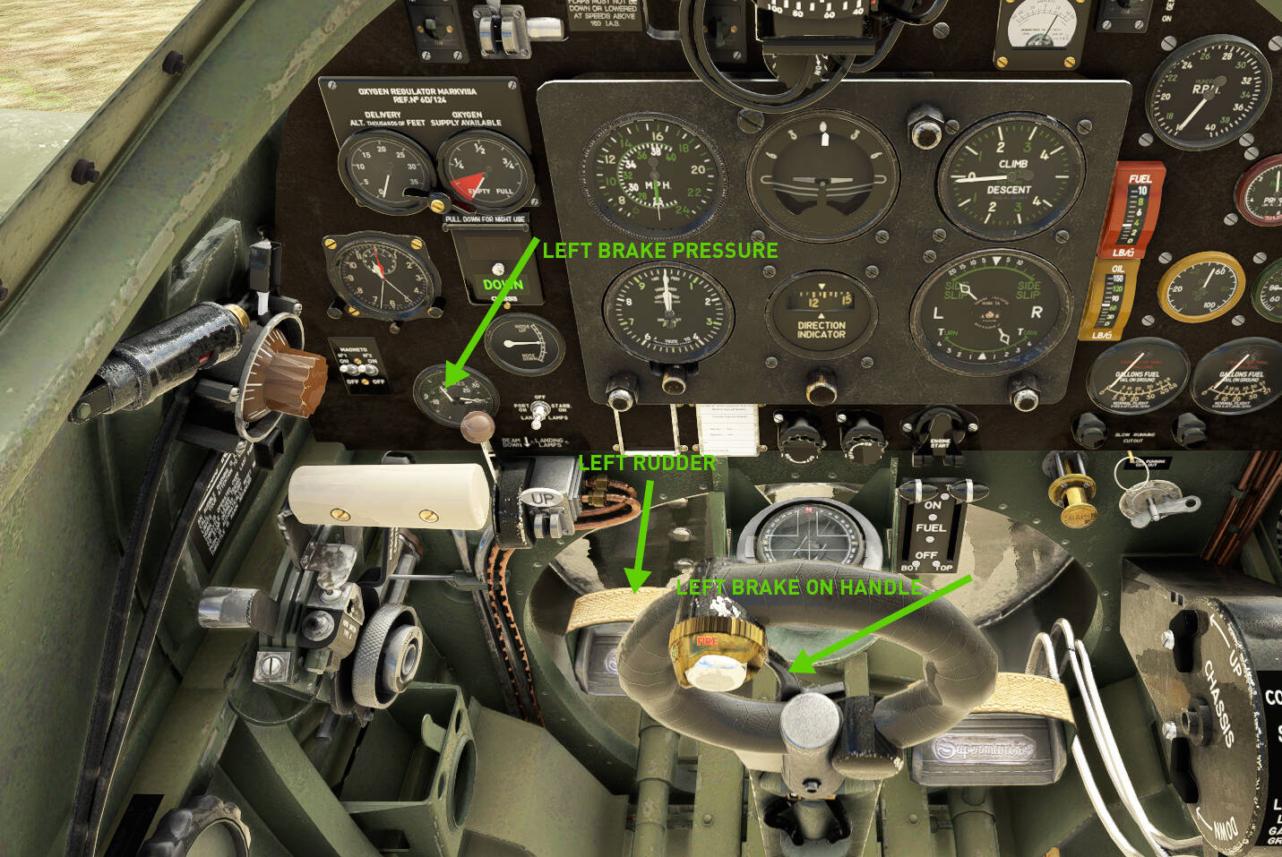 Here is shot from our Spitfire during a left turn on the ground. As you can see I am pressing the left pedal, the brake handle on the grip is squeezed a little and the gauge is showing left brake pressure. Please tell me if all of this is wrong because all I am trying to understand is where I need to correct if necessary.