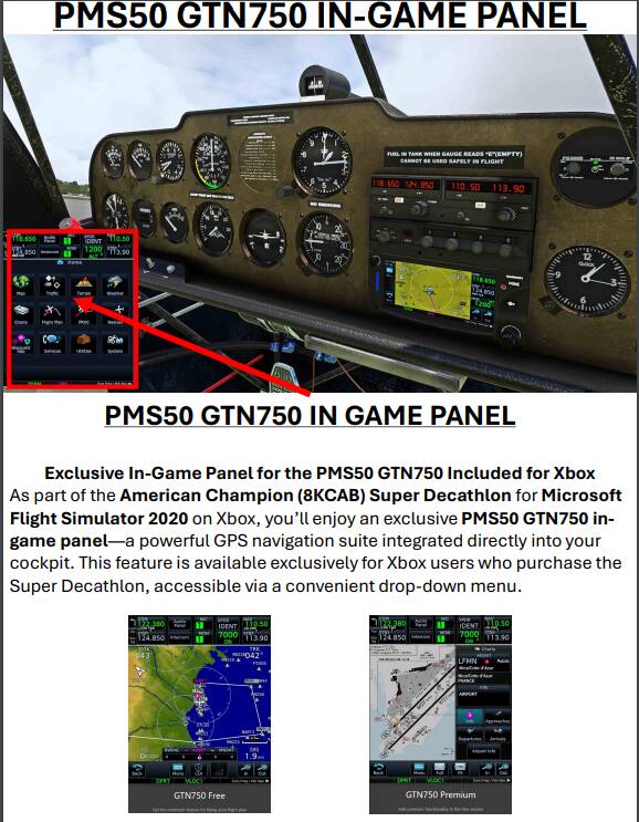 The Analog Variant also has an Auto Pilot function, but yes, it is hidden. However in the swap of the GPS to the GTN650 or the In Game Panel GTN750 dropdown in the analog variant the PMS50 full version does have an Auto Pilot included in its package, otherwise you would have to rely on key bindings to an AP setup. With the Super Decathlon exclusive for XBOX the In Game Panel is only available by owning the Super Decathlon. And yes, the In Game Panel then functions with every aircraft in the simulator just like PC has had for years.