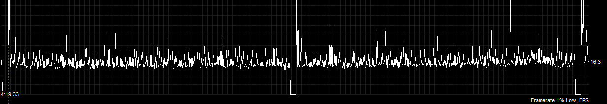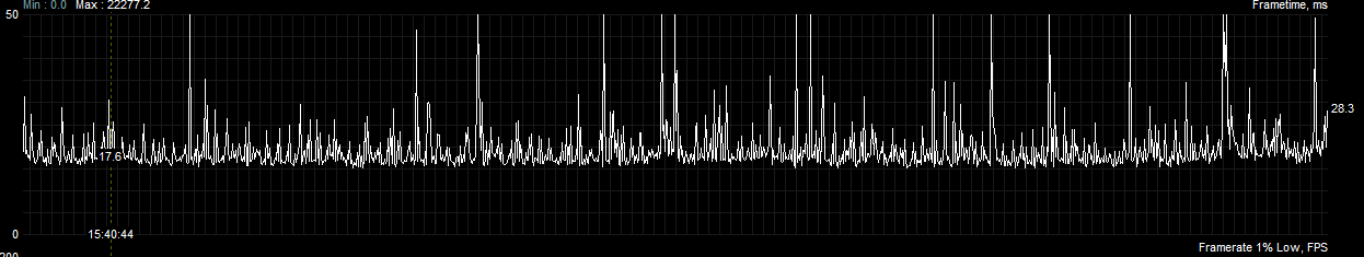 Sure the frametimes are still atrocious, but that’s mostly due to the game seemingly being unable to leverage more than a few of my CPU threads (and I’m flying over Seattle at the moment). Compared to the first frametime graph where you can see literal 2 second pauses, this is miles better.