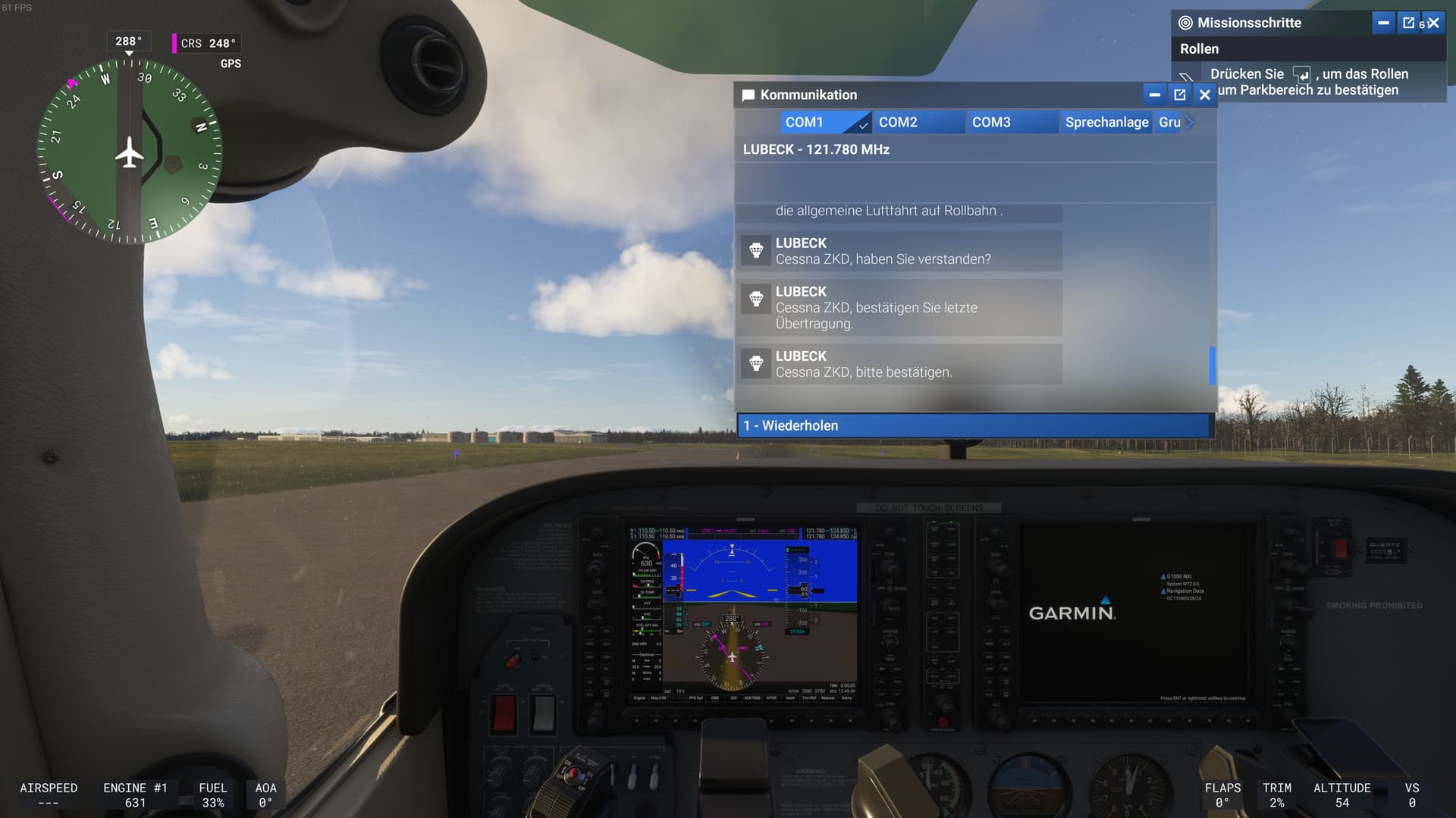 After the landing of the PPL Certification at EDHL I leave the runway, hold short, got handover to ATC Ground, Request instructions to taxi to parking location, ones the information came from ATC the “Enter” Button do not work anymore to readback to ATC. Also in ATC Menu only the option “Say Again” is present. From there the Certification is stuck in this state.