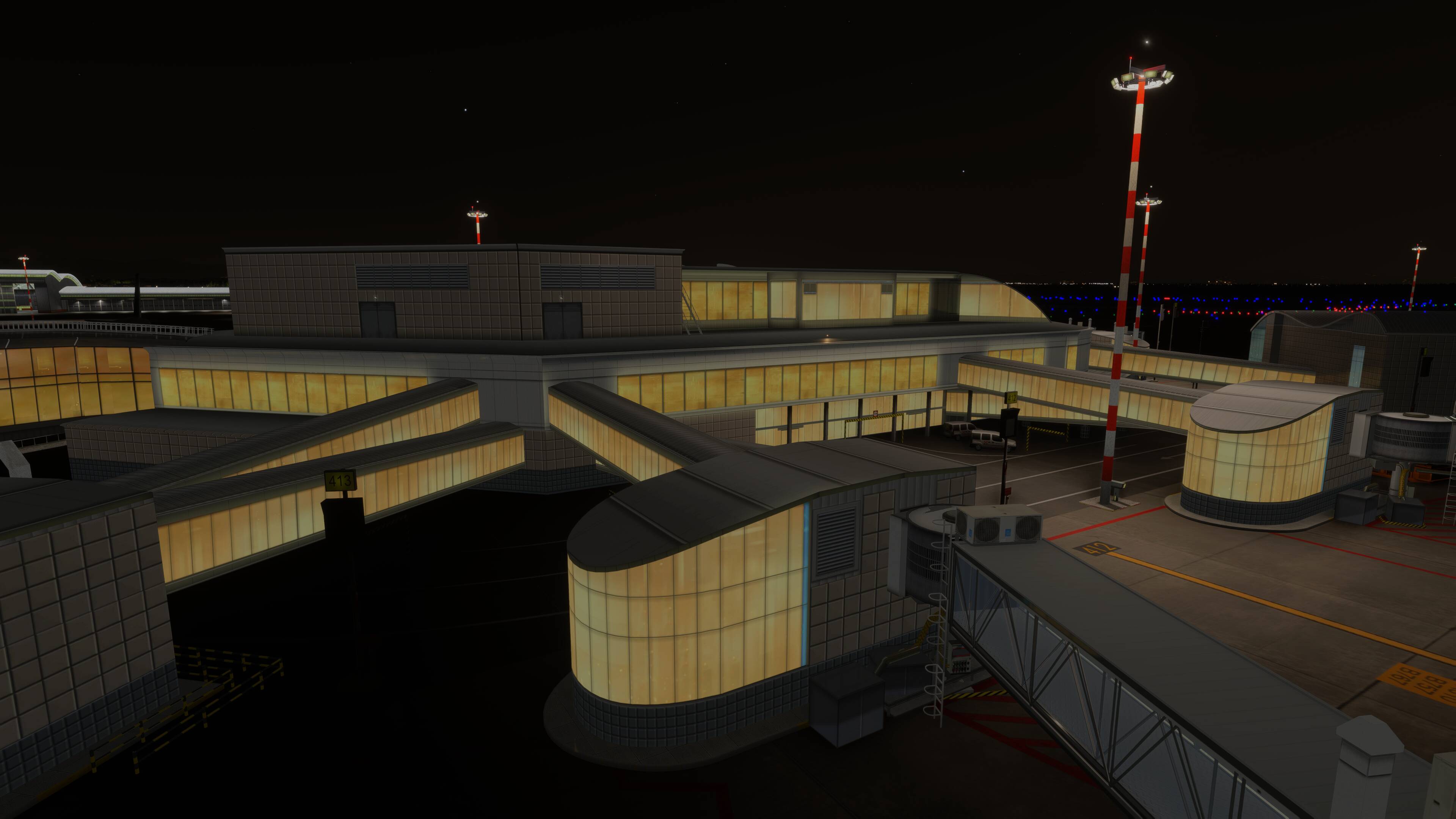 The scenery’s greatest strength is its ground textures but ‘greatest’ doesn’t mean ‘great’ and they’re at best the good side of average for a 2025 scenery (which this native version is). There’s a fair bit of custom GSE lying around across the various aprons but it’s quite repetitive, with only a handful of different models. Some of this GSE is animated but one particular asset (a baggage cart) is so jerky that you’ll wonder if its fps reaches the number of digits present on one hand! Taxiway edge lighting is custom but approach lights are default and carelessly placed, with some sunken so deeply into the ground that you can’t even see them! I did wait a good few seconds to see if they’d correct themselves but… they didn’t.