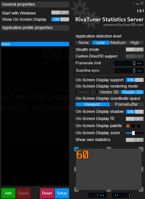 RTSS displays the overlay without any issues as soon as MSFS 2024 SU5 beta 1.7.7.0 is running. I have MSI Afterburner in beta version 4.6.7, downloaded from the official MSI website, and RTSS in version 7.3.7.28314 Below is a screenshot of RTSS – everything works fine, so compare it with your own settings.