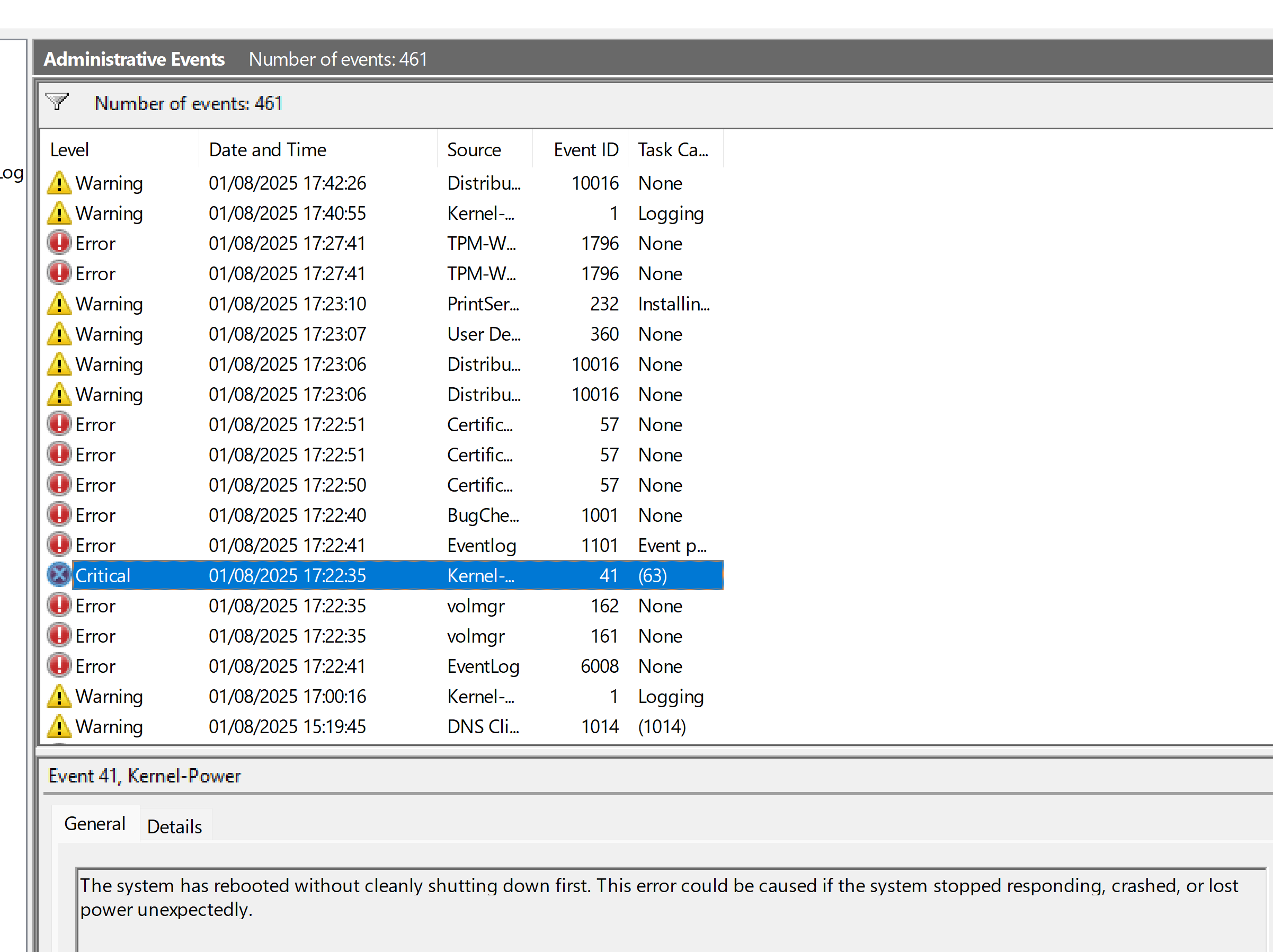 Those Event Viewer entries - like TPM errors are nothing serious. That one probably shows up because Secure Boot is disabled in the BIOS. Totally fine.